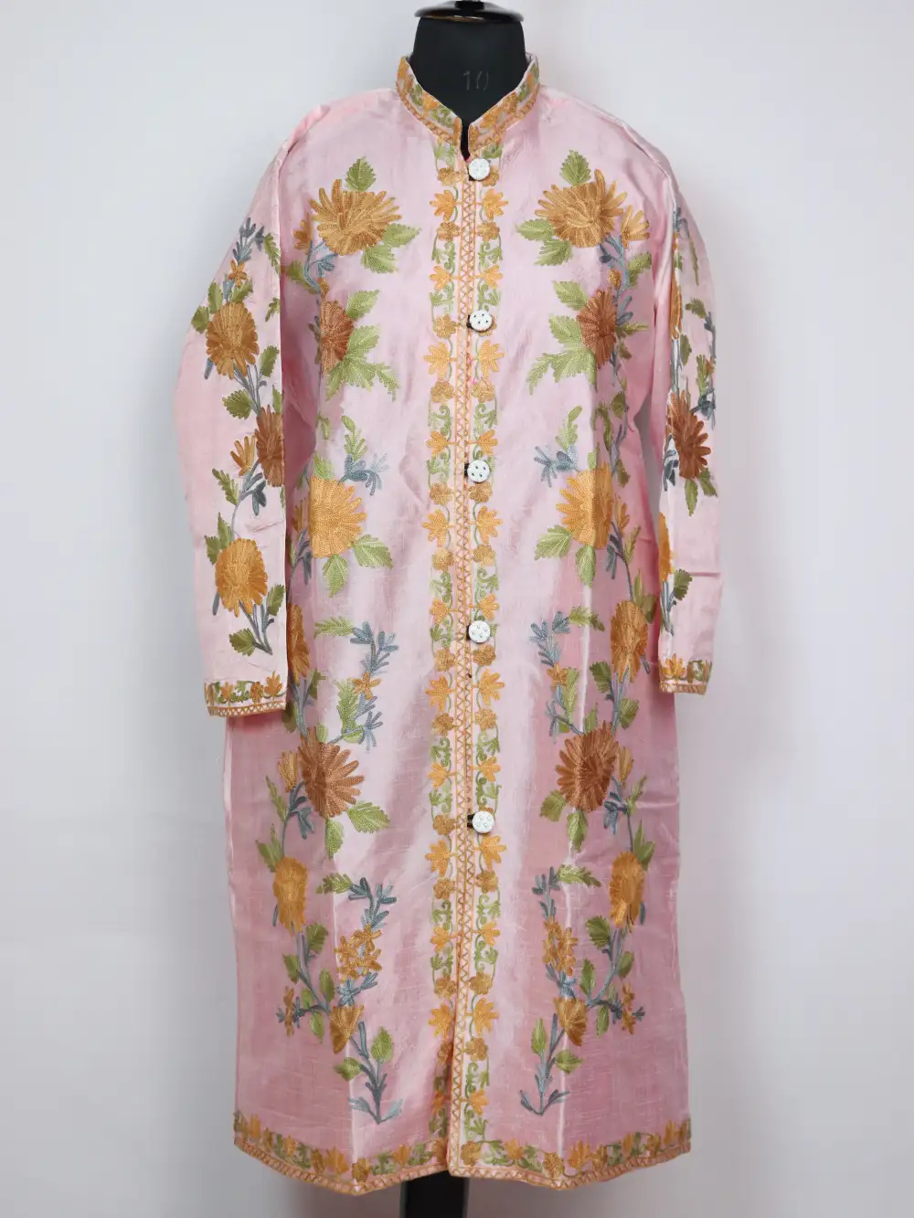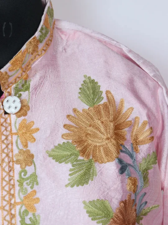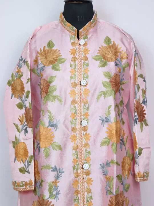 The front of this silk coat is decorated with floral aari embroidery along with sleeves, giving it a graceful and classy look.