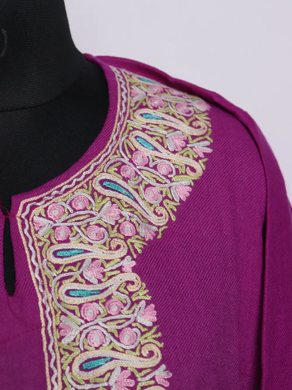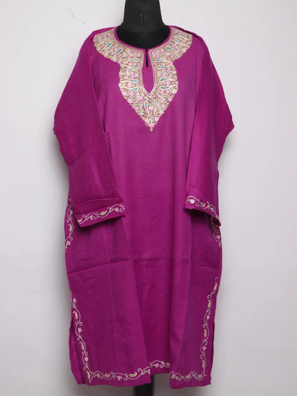 Raffal Wool in light purple with hand Aari kaam at the neckline in continuous badam and floral motif shapes this Kashmiri woolen phiran, It has chest size 56 and length 44, it gives this phiran room to layer over warm layers.
