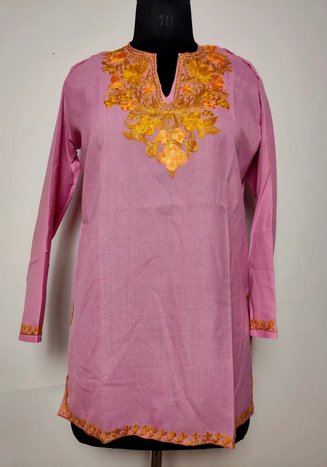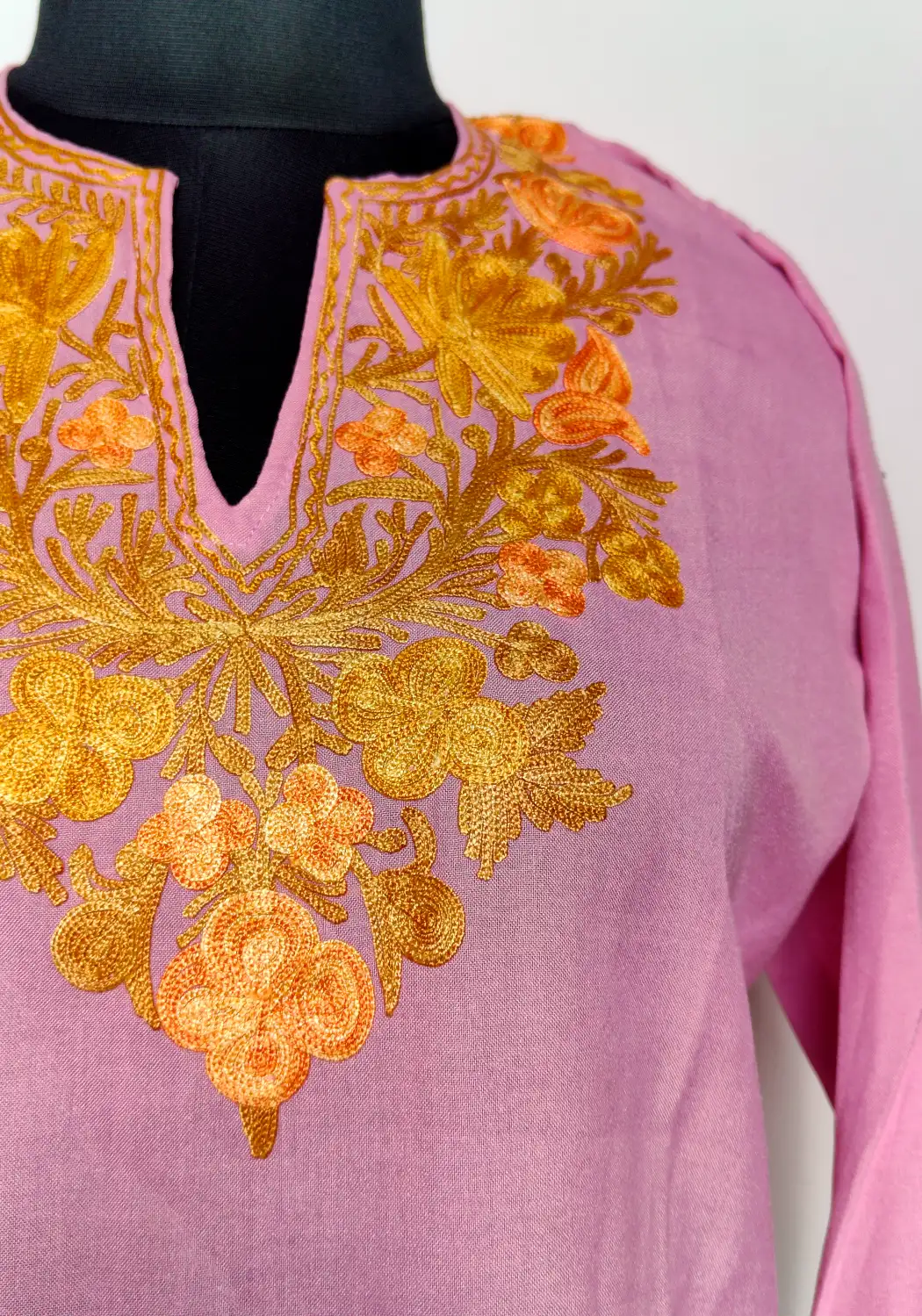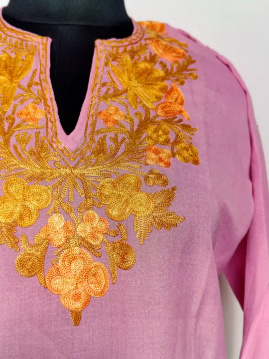 This aari work leaf design kurti is crafted in breathable light purple summer cool cotton. The neckline carries floral embroidery which adds softness to the overall look. Simple in design yet thoughtfully detailed, it reflects an easy and graceful Kashmiri aesthetic.