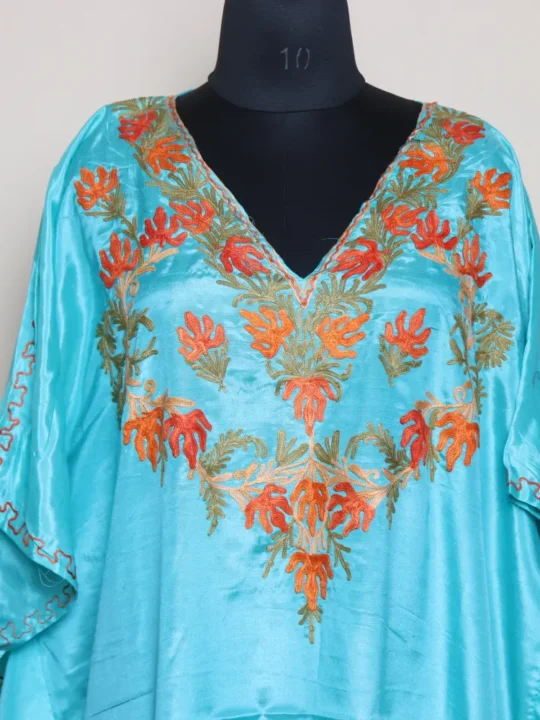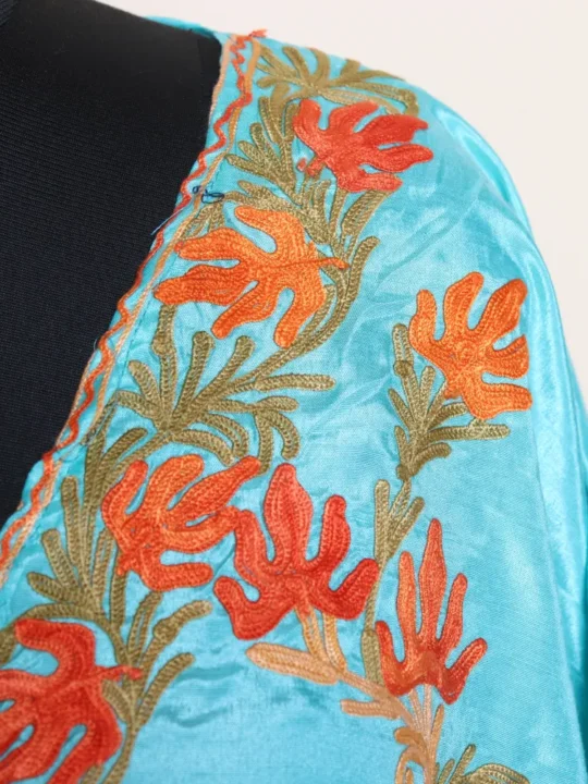 This cotton silk kaftan brings comfort and elegance together in just the right balance. The red chinari touched Aari embroidery around the neck and main flower pair in damaan against the green base adds a traditional Kashmiri touch—flowing gently across the surface without overwhelming the design. Made in Srinagar, it’s a graceful piece that moves with ease and carries a bit of heritage in every thread. Perfect for slow mornings or gatherings with a soulful edge