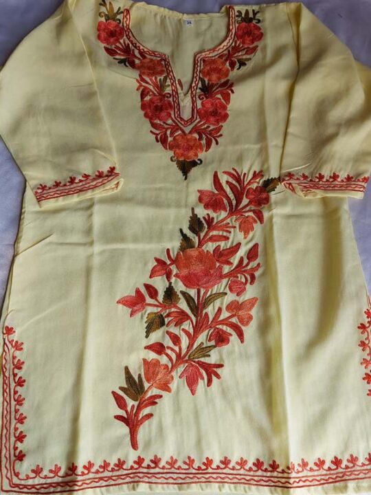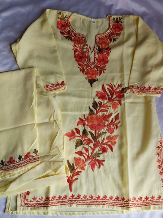 Light Yellow Aari Work Kids Summer Cool Cotton Kurta With Trousers (L 25)