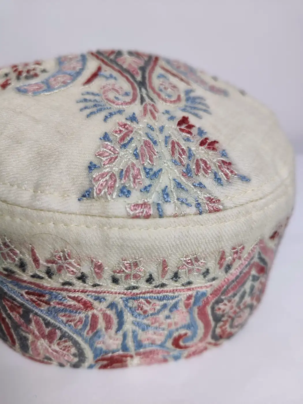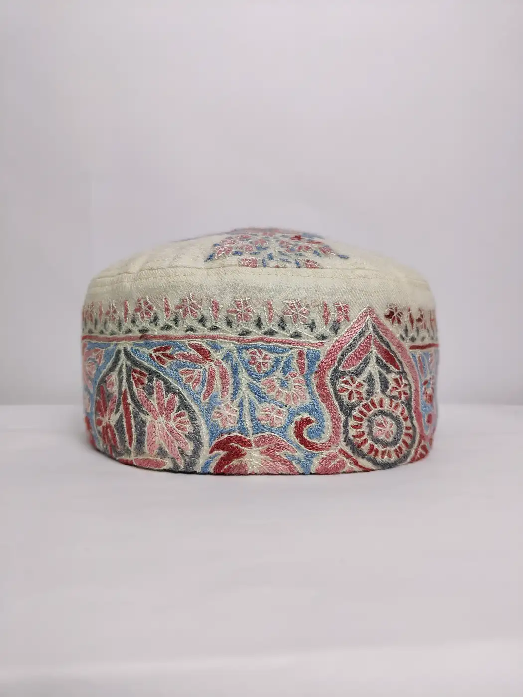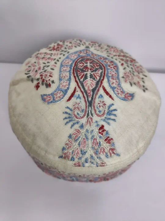 Crafted in cream MP pashmina, this lightweight Kashmiri cap carries elegant hand sozni embroidery. A striking paisley motif decorates the crown while continuous patterns flow around the sides, giving this topi a subtle Kashmiri charm.