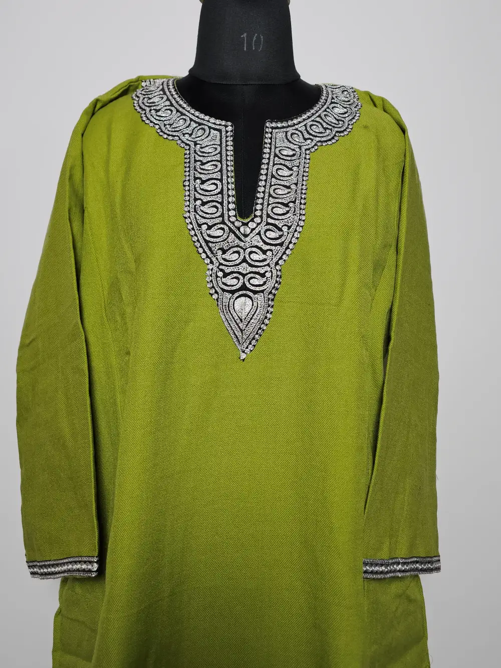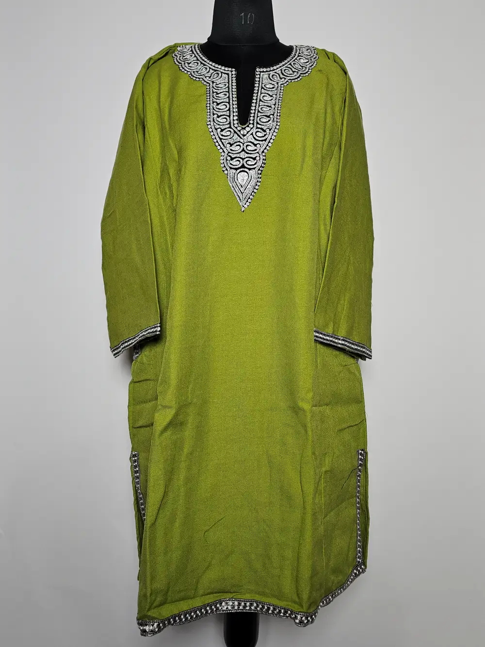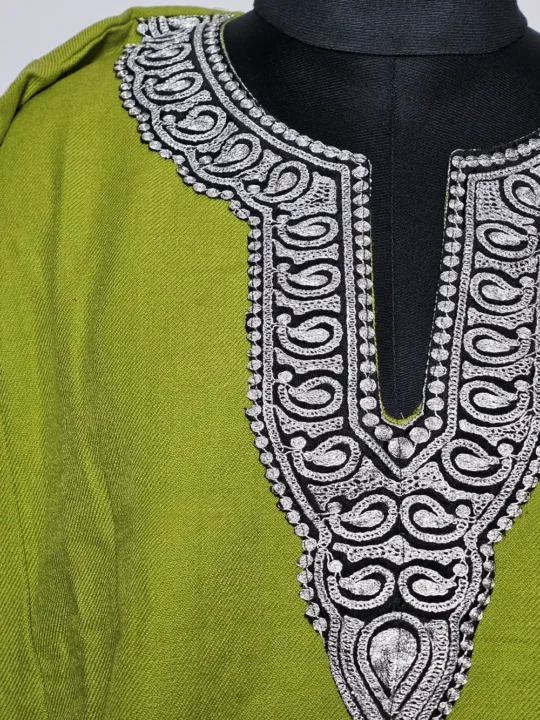 Lime green phiran dress crafted in cashmilon wool presents zari tilla embroidery at the neckline with tiny badam motifs stitched across the neckline in continuous pattern. It includes pockets both side for daily ease.