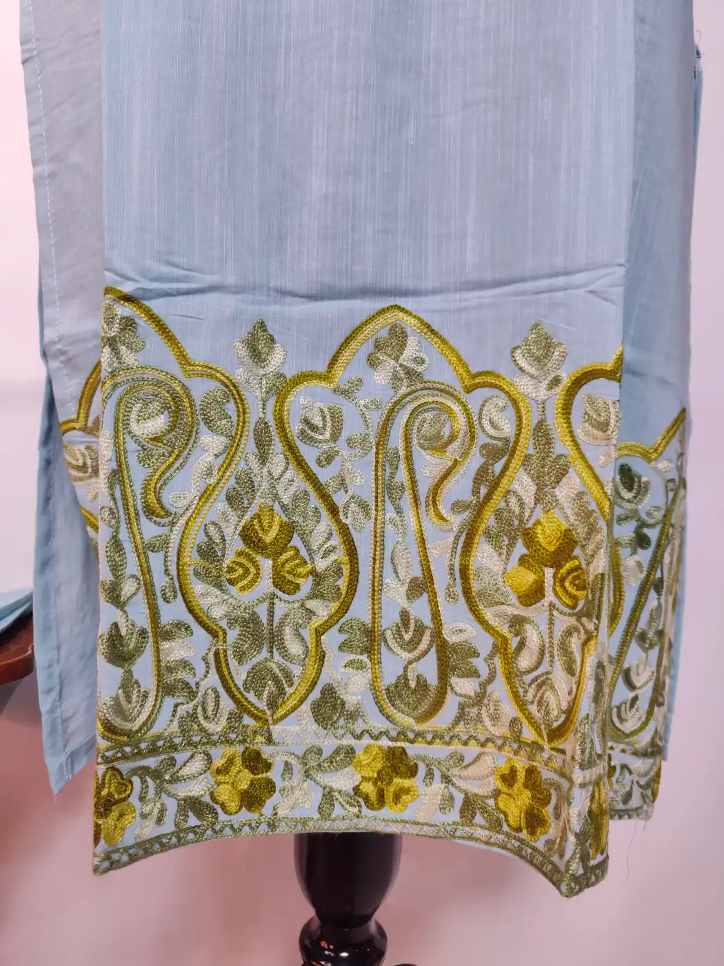 Tailored in cotton, this blue colour Kashmiri kurti set presents aari embroidery defining the neckline and daman in floral motifs. The kurti is paired with trouser. Measuring 42 inches chest size and 41 inches length, this set sits with graceful ease.
