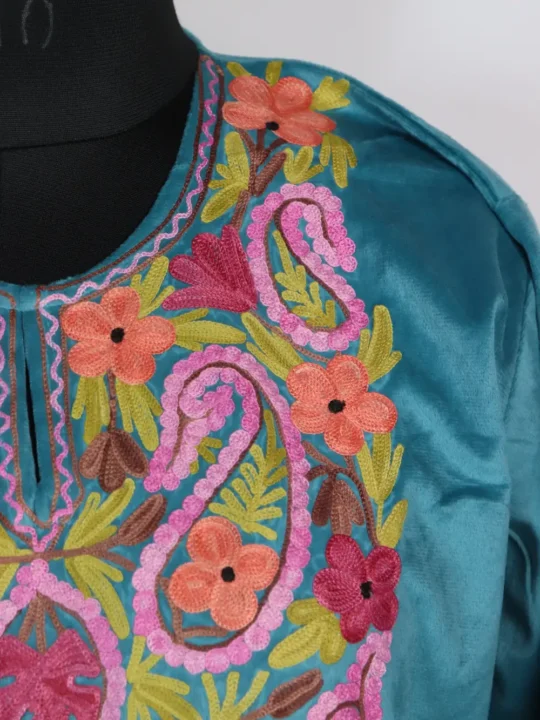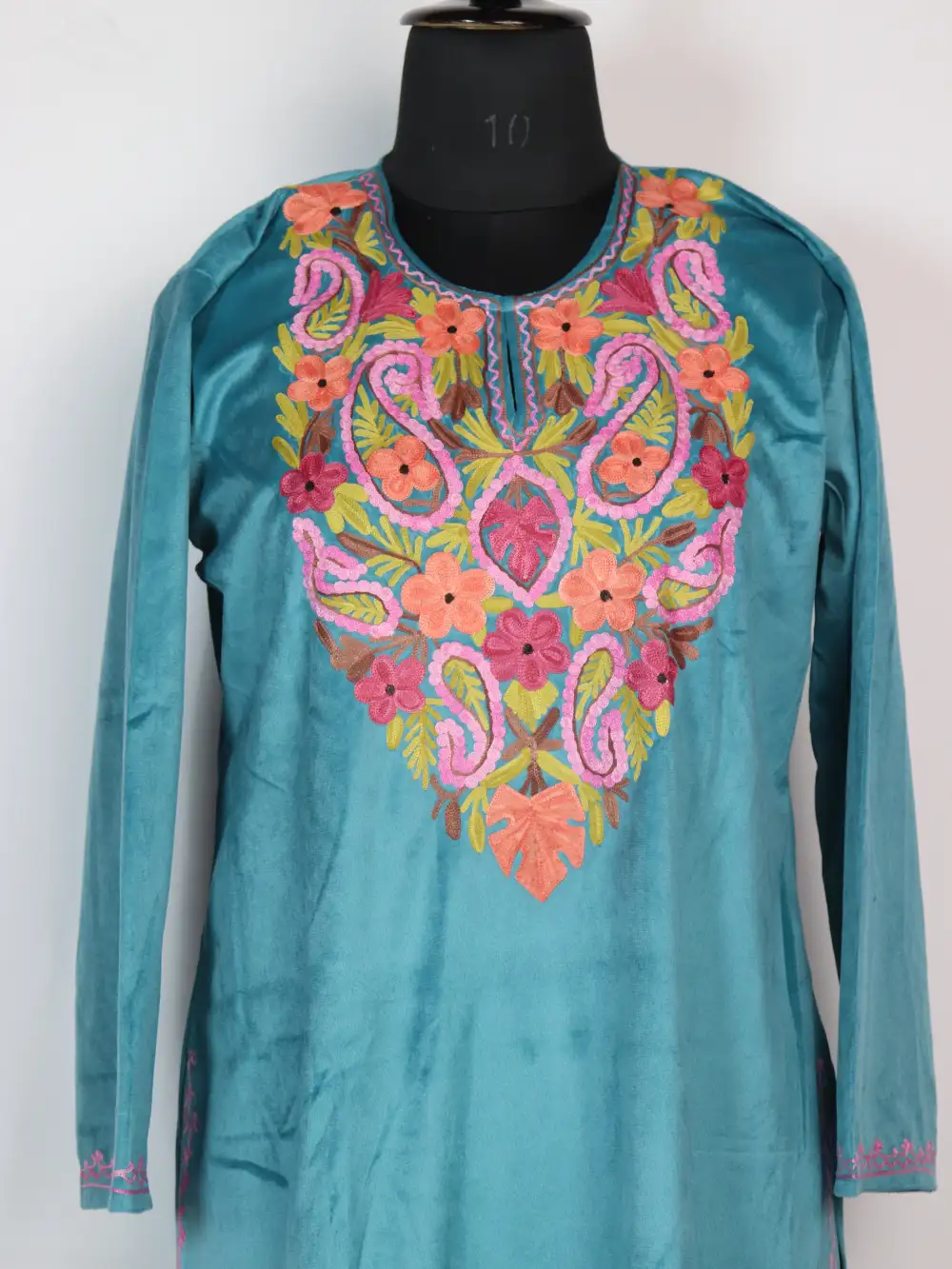 This maroon blue velvet kurti features beautiful floral aari embroidery in multicolour around the neckline. The soft velvet fabric give it a graceful and elegant look, perfect for winter wear.