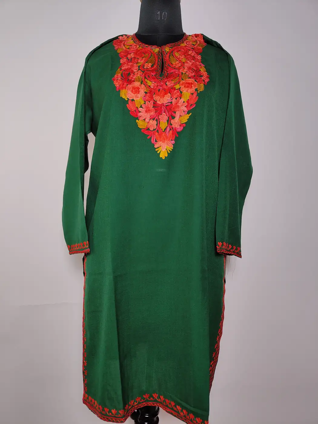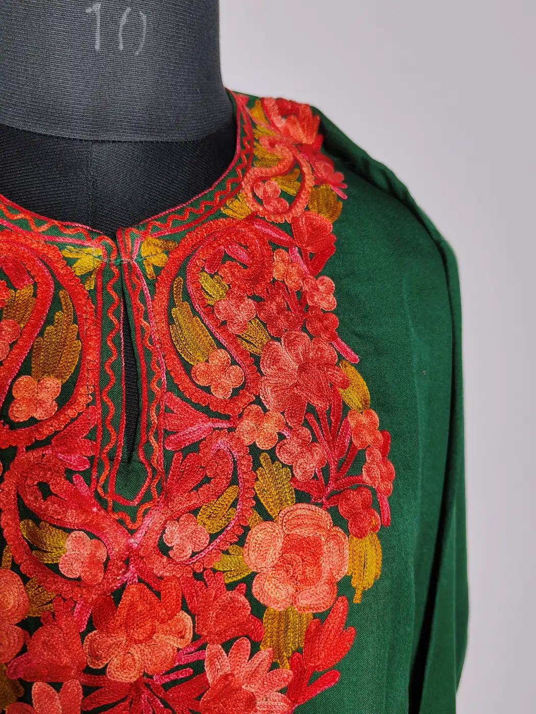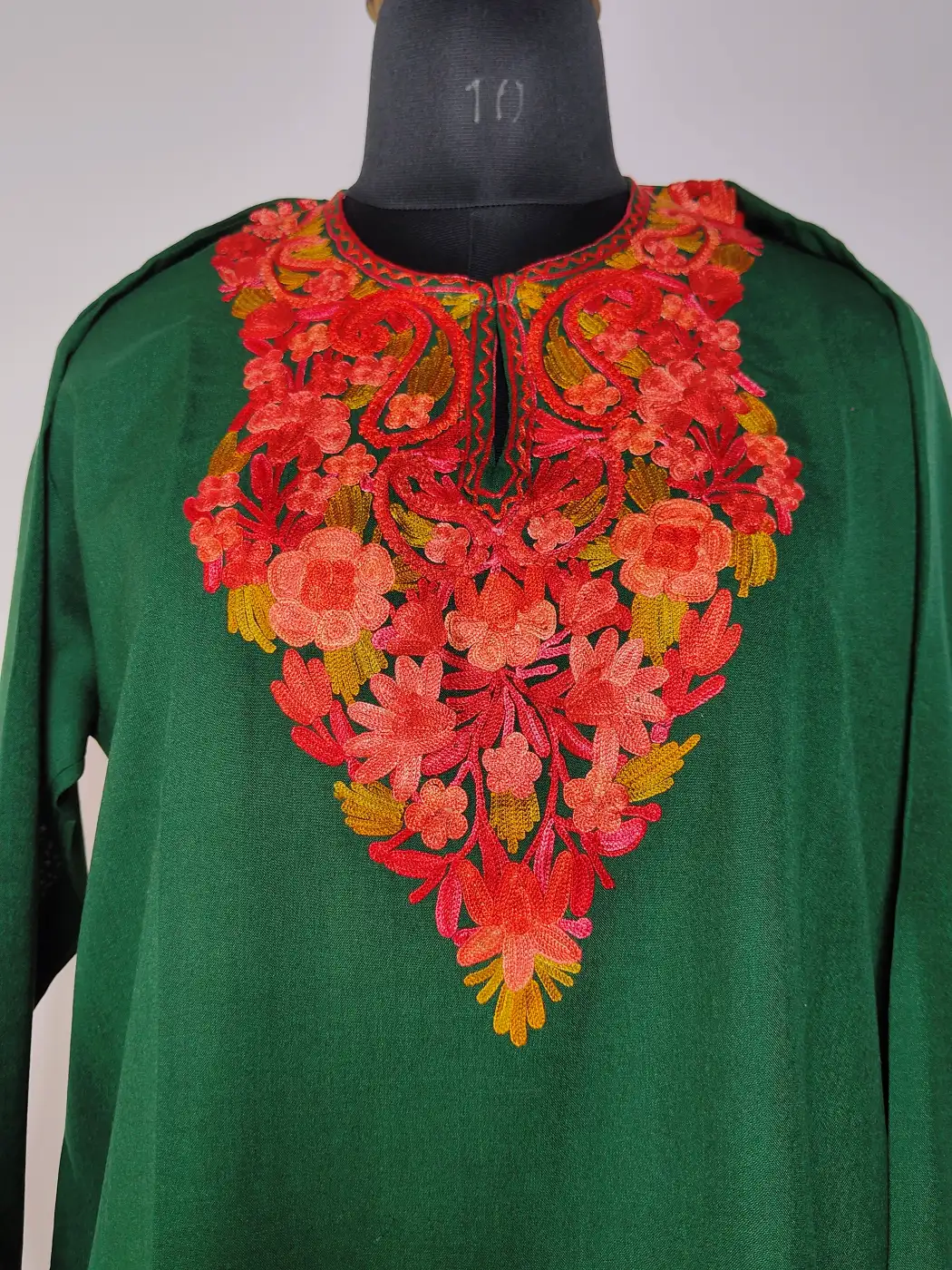 This big size kurti is designed in dark green summer cool cotton with floral aari embroidery highlighting the neckline. The relaxed feel and breathable fabric make it comfortable, while the embroidery adds enough elegance to this daily wear.
