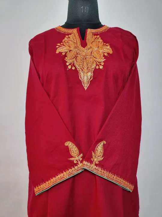 The maroon kurti set comes with a matching trouser, which forms a coordinated ensemble with timeless Kashmiri charm. Designed in airy summer cool cotton, this Kashmiri kurti coord set highlights detailed botte tilla embroidery. The neckline of the kurti carries a graceful embroidered border, which has been complemented by a prominent floral motif at the centre front. And those elegant sleeve cuffs badam embroidery subtly enhances the beauty.
