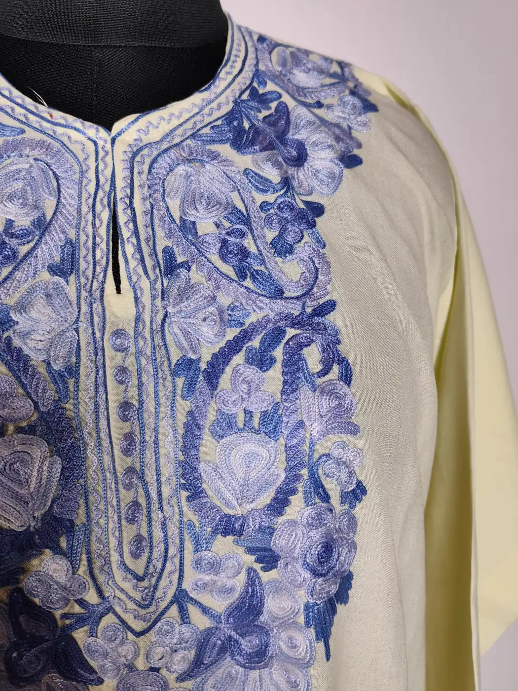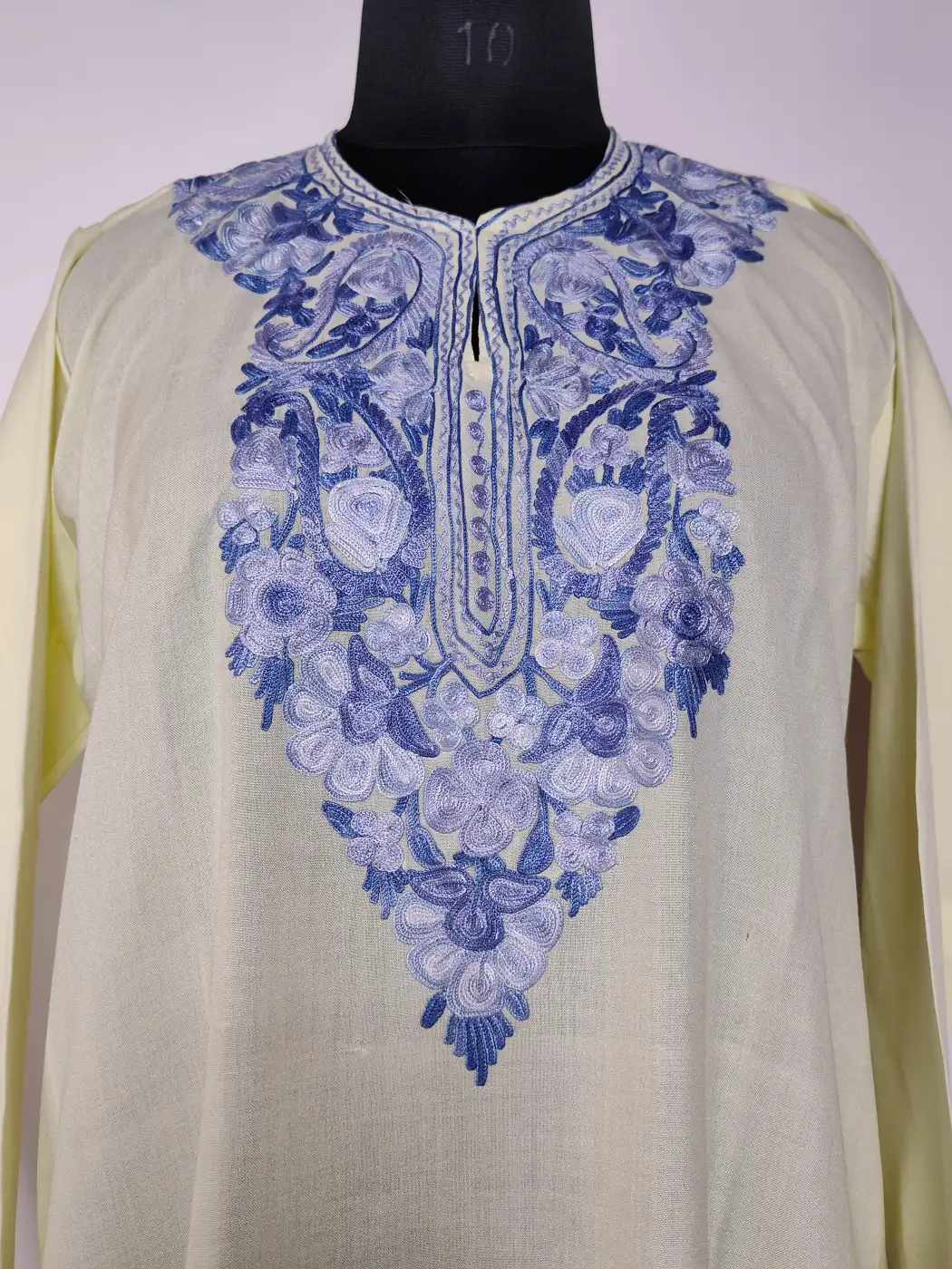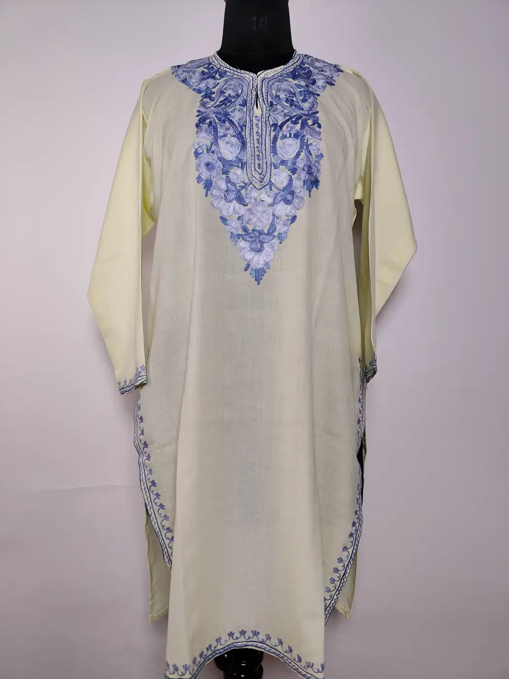 Crafted for everyday ease, this long cream Kashmiri kurti carries floral aari embroidery at the neckline. The summer cool cotton fabric keeps it breathable, while it reflects its balanced design that feels both simple and refined.