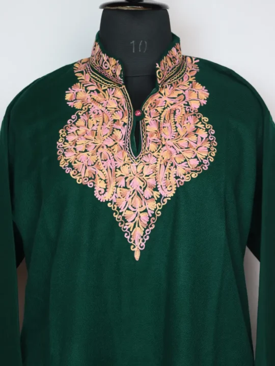 A warm Cashmilon long kurta with decent Aari floral and touch of badam work placed around the neckline and along the collar.