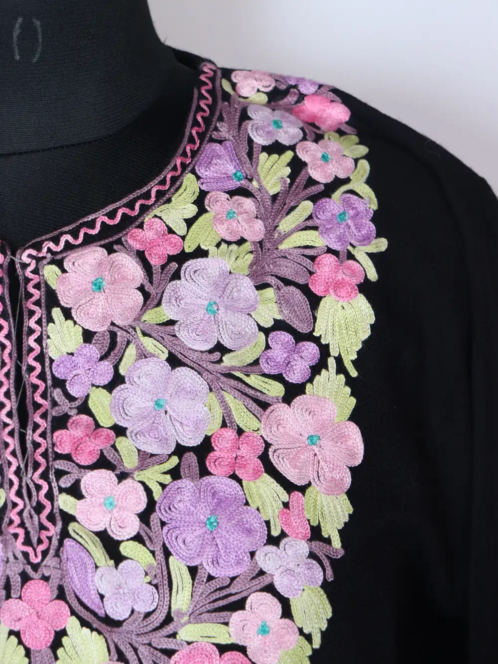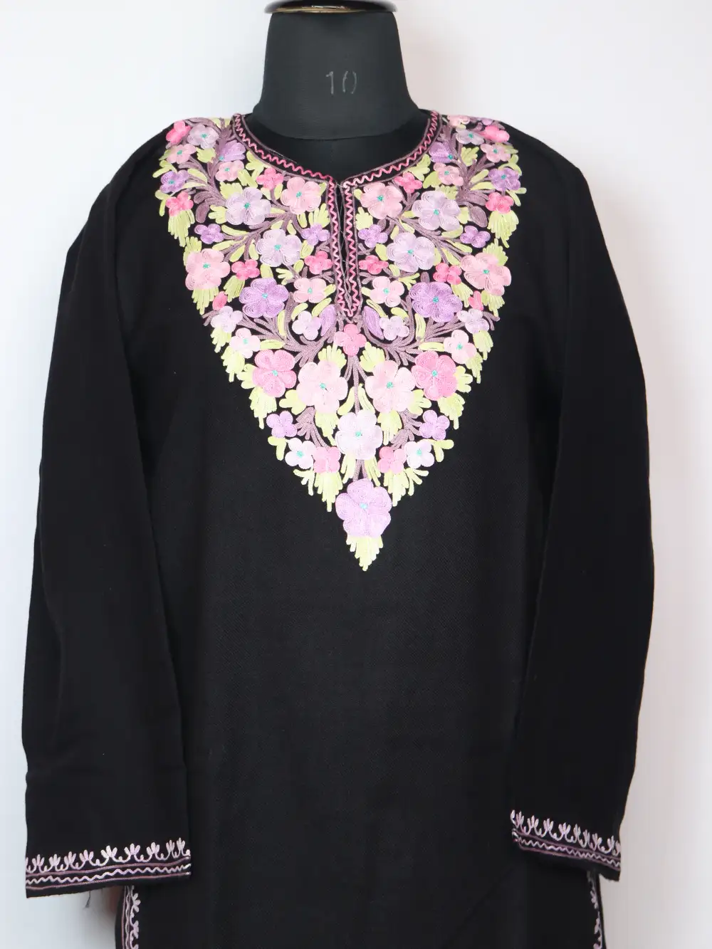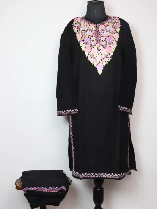 A Cashmilon wool kurti 2pc set with elegant colorful floral embroidered motifs, the fabric feels warm and easy to wear everday. This set includes kurti and trouser.