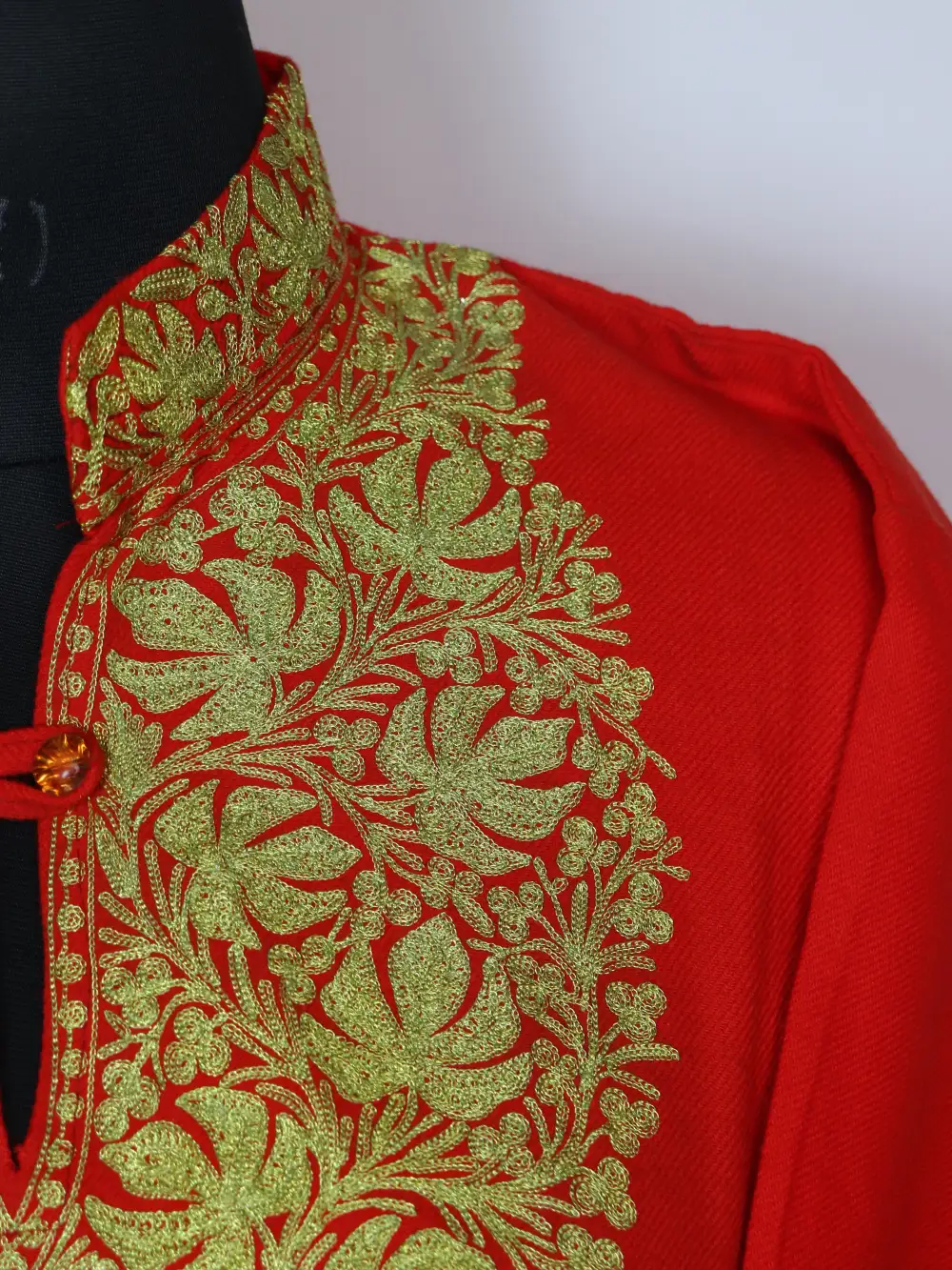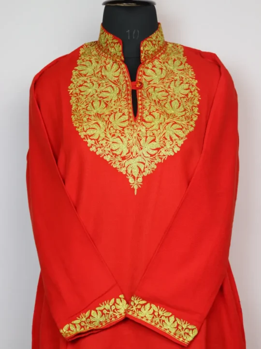 This Cashmilon wool long kurta comes with a neat zari chinari embroidery around the neckline and collar