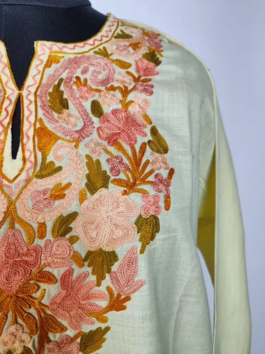 Made in summer cotton for refined attire, this pastel yellow colour office wear kurta set highlights aari embroidery at neckline in floral and badam patterns. It includes kurti and trouser. It comes in 46 inches chest size and 37 inches length.