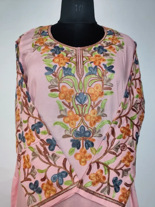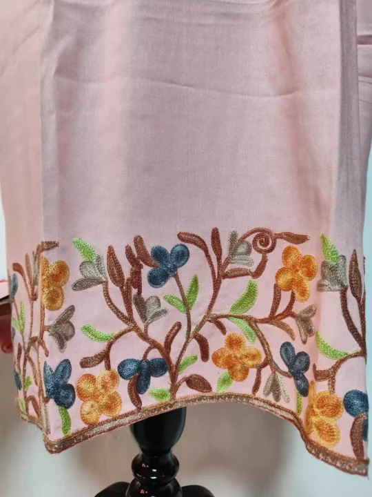 Crafted in cotton, this pink colour Kashmiri Kurta set carries aari embroidery which is placed at sleeves and border in jaal patterns neckline in chinari motifs. This set offers ease and neat fit.