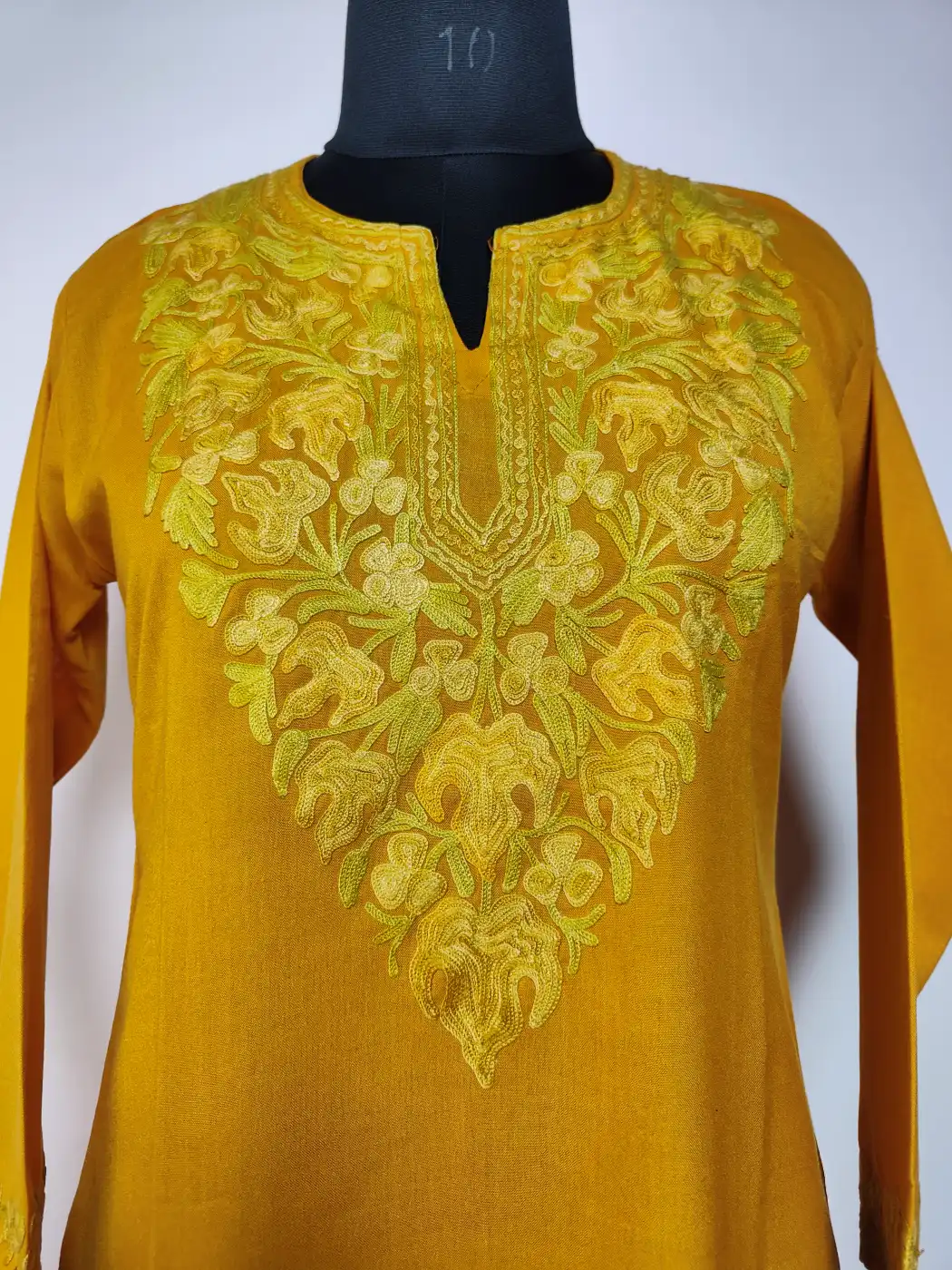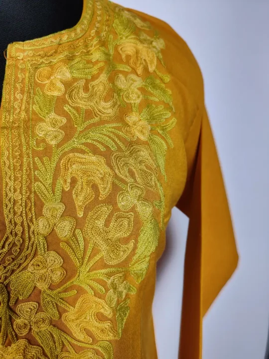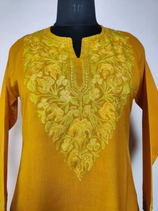 Crafted in summer cool cotton for easy wear, this mustard colour kurti set is made for office. It showcases Kashmiri aari embroidery at neckline in floral design. It includes kurti and trouser.