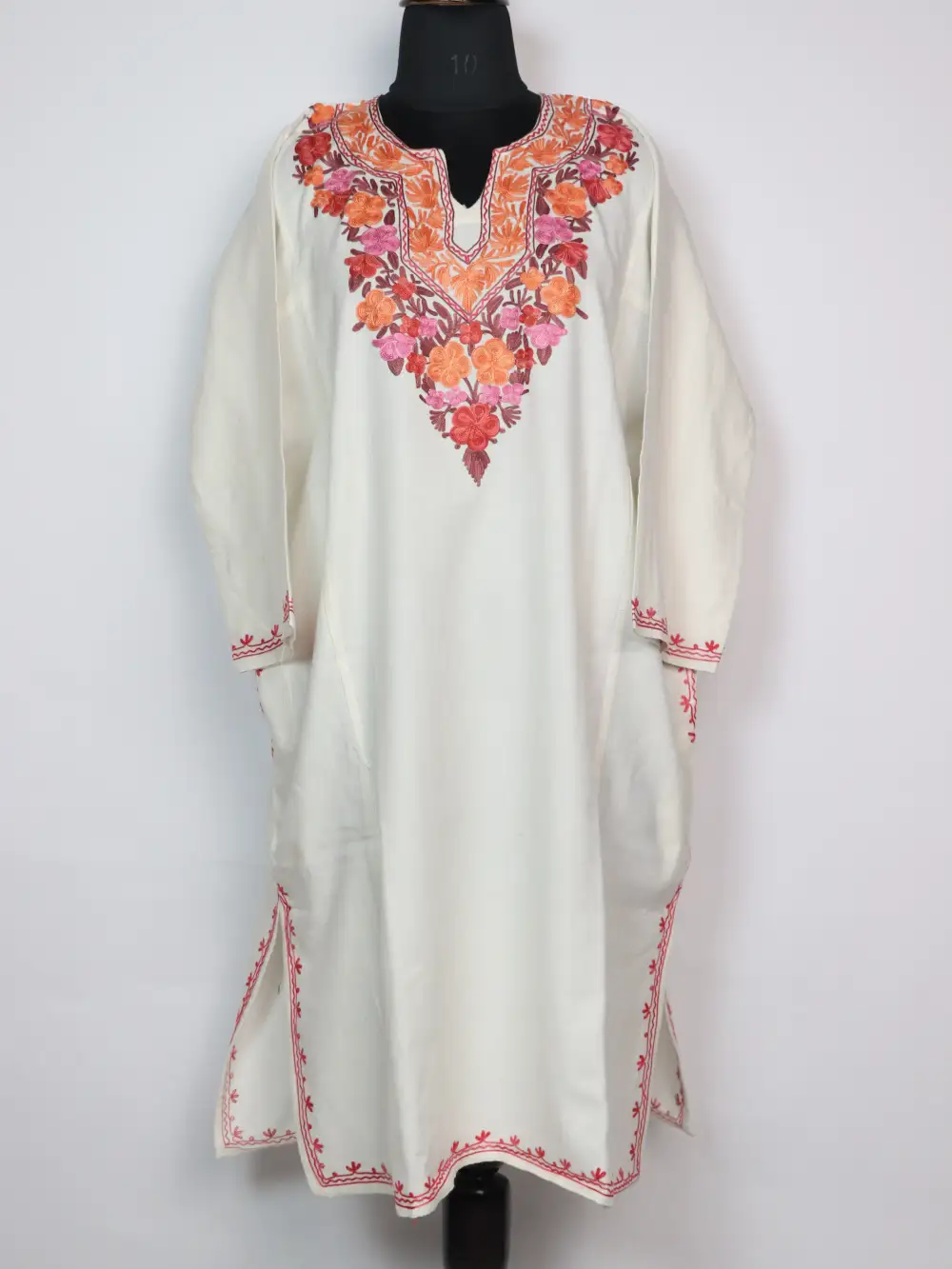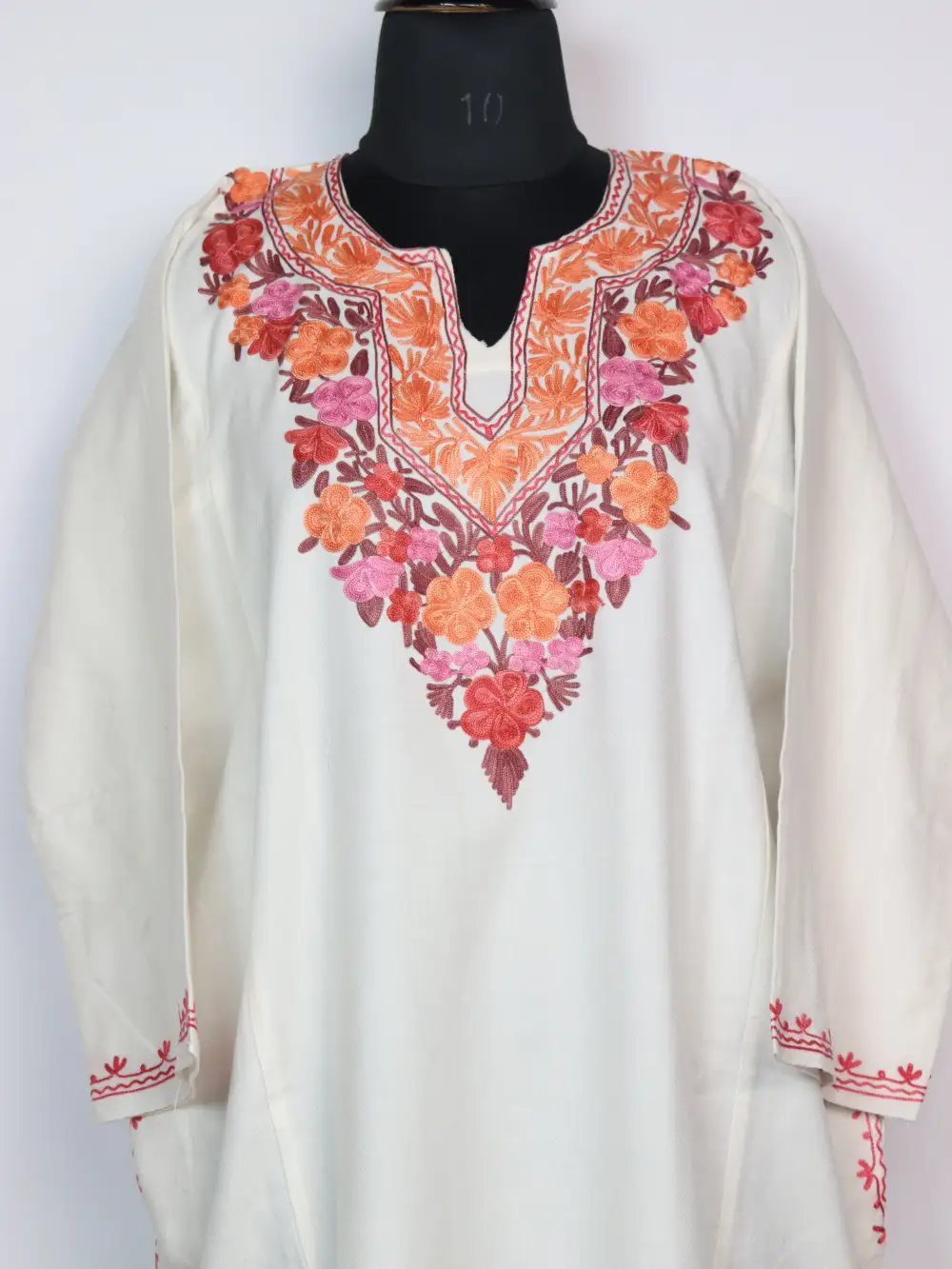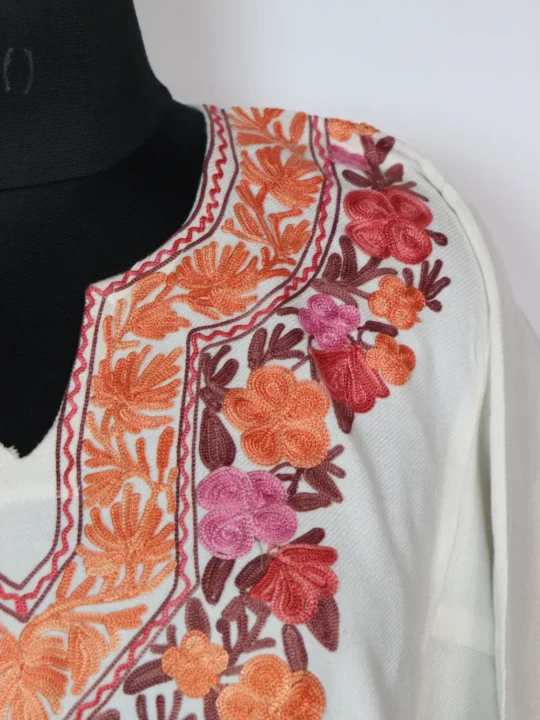 White colour Kashmiri pheran shows Aari work in floral motifs running around the neck area of this phiran. It features pockets both side for easy use. Wear it layered or solo for a composed winter wardrobe staple and everyday comfort.