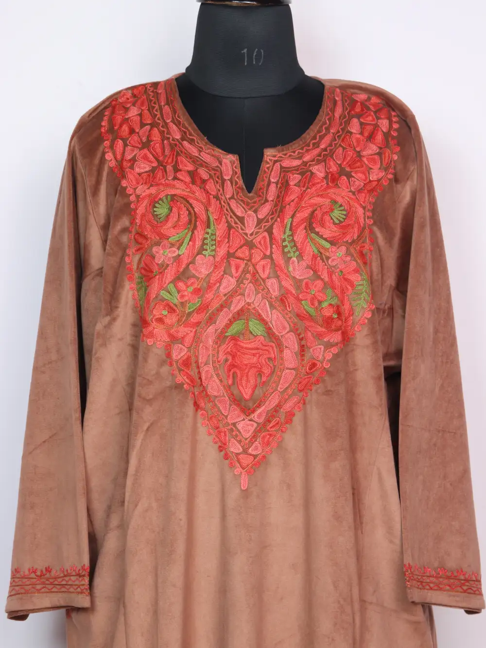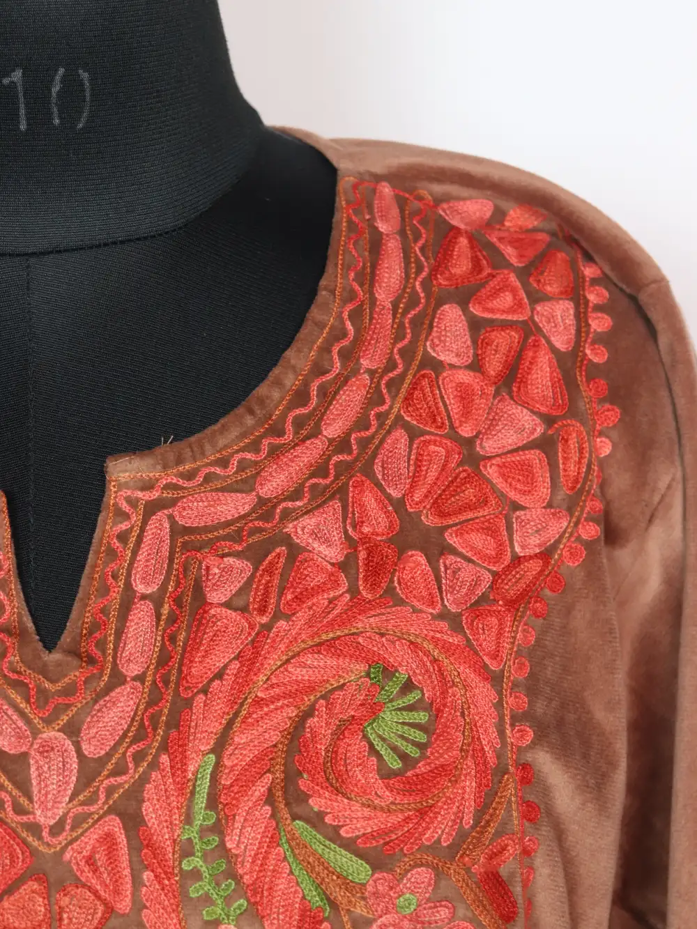 Velvet kashmiri phiran in brown hue shows aari embroidery at the neckline. It comes with chest size 55 inches and length 43 inches that gives an easy, flowing fit.