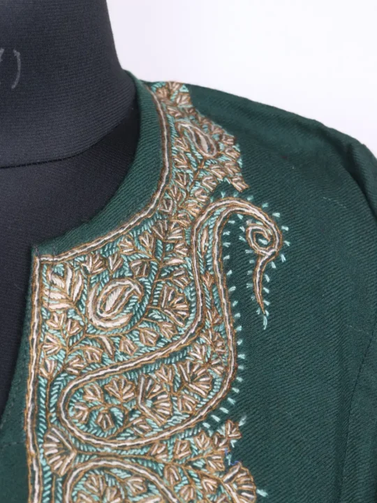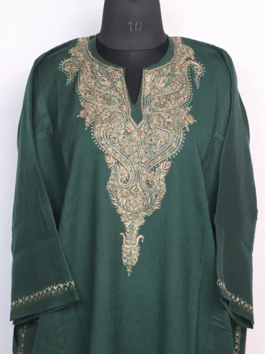 A practical phiran dress in green Raffal Wool carries floral badam hand sozni embroidery at the neckline and pockets both side for day-to-day ease. The phiran dress offers reliable warmth and a quiet Kashmiri touch while remaining easy to wear with neutral bottoms.