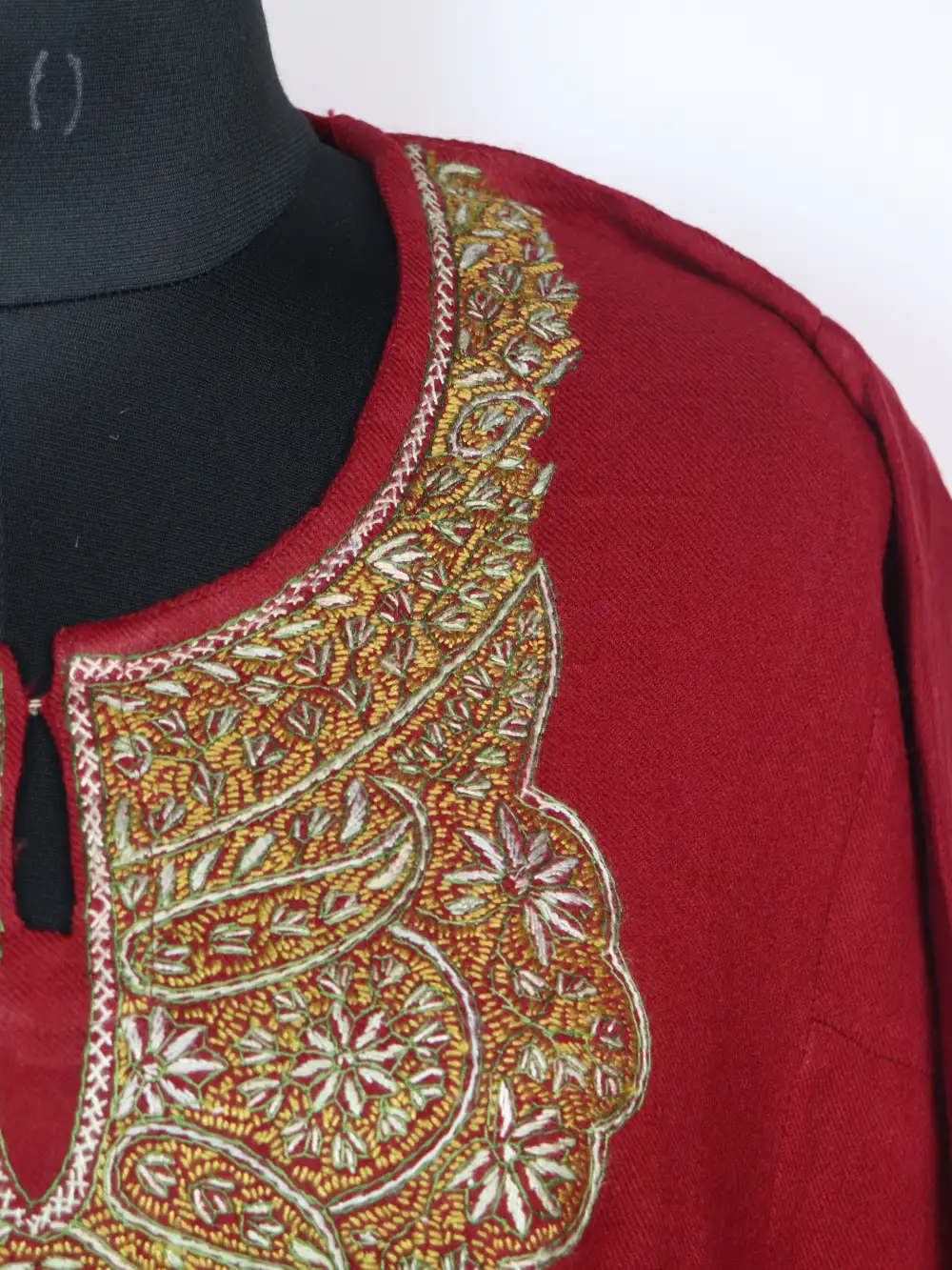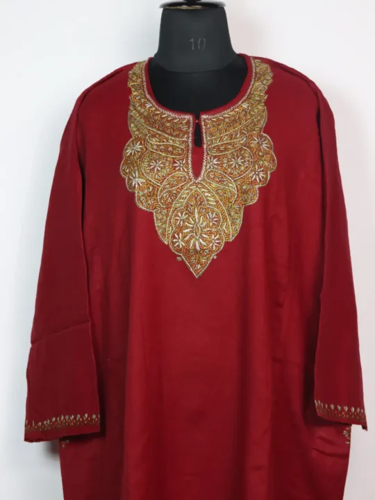 Elegant female’s Kashmiri phiran cut from raffal wool, finished with hand sozni embroidery at the neckline. It has pockets on both sides that lend ease for small essentials.