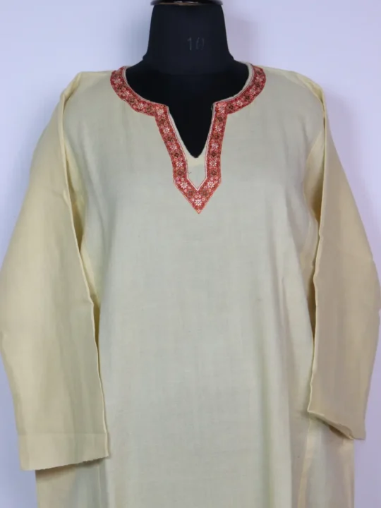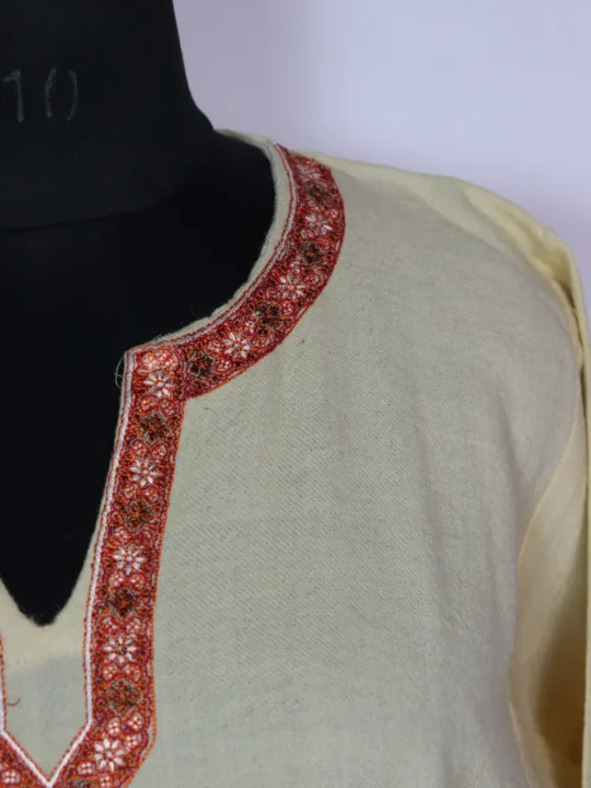 Raffal Wool shapes this cream stylish phiran kashmir with floral Hand Aari at the neckline. Chest size 54 inches and length 43 inches gives a relaxed fit.