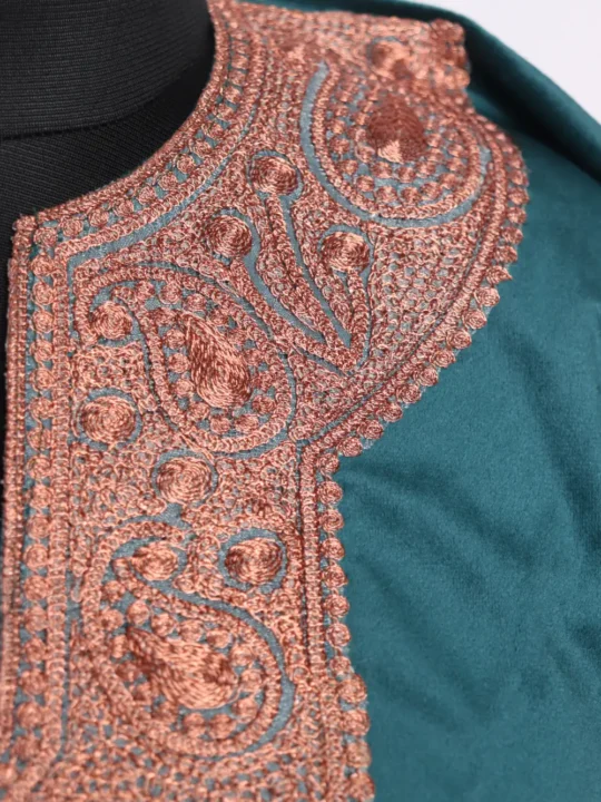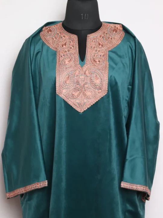 A green Pheran in holland velvet trimmed with Zari Tilla badam at the neckline, it carries a composed Kashmiri work feel. Its chest size is 54 inches and length 46 inches which create an easy, layered fit. The embroidered neckline and velvet texture together make this Pheran a calm, elegant piece.