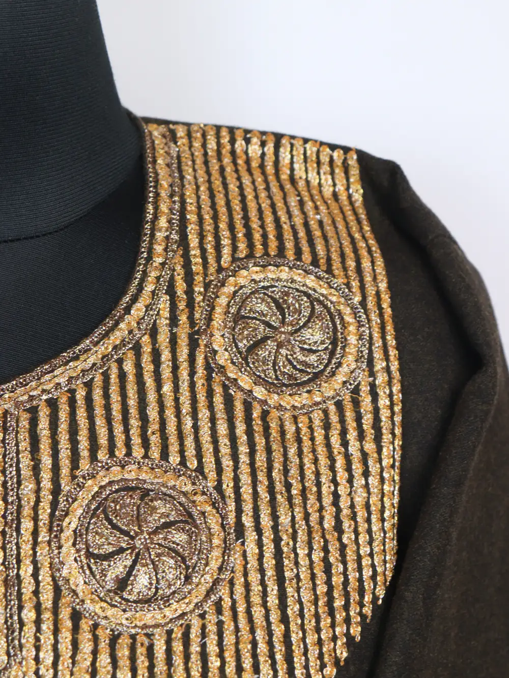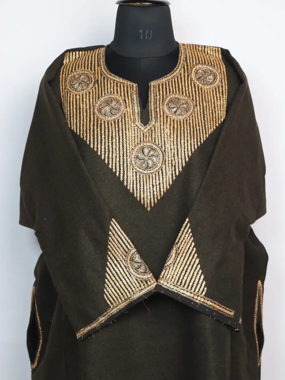 Made in tweed wool with tilla kadhai at the neckline in striped patterns, this Kashmiri traditional dress also features pockets on both the sides for everyday use.