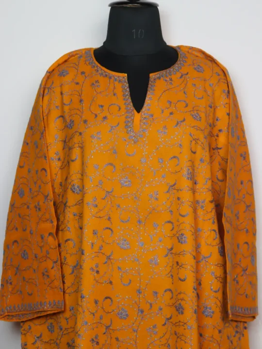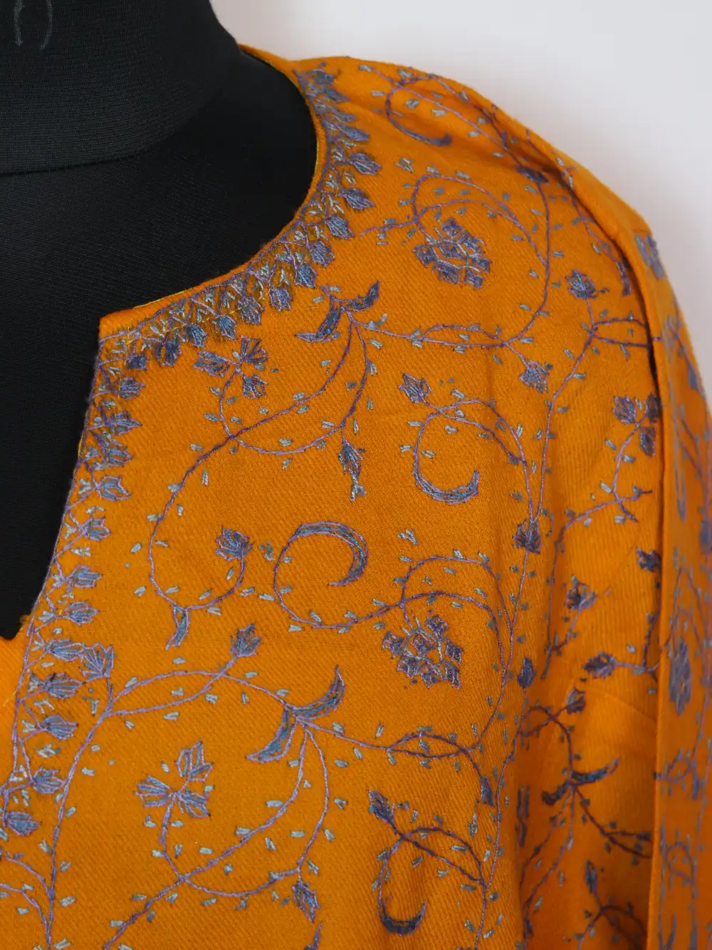 Raffal wool gives this yellow hue Kashmiri phiran dress a structured yet wearable feel. Its hand sozni embroidery enhances allover the pheran in jaal style.