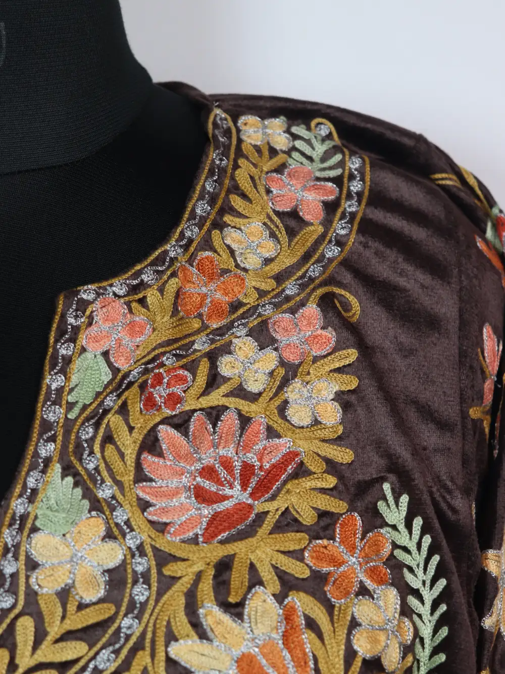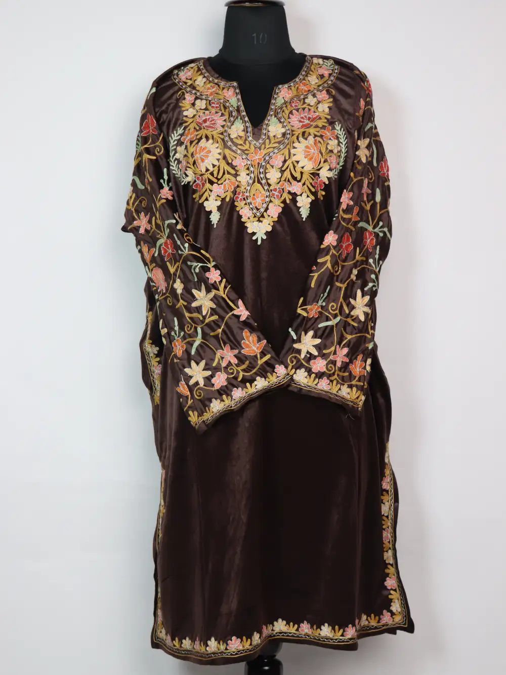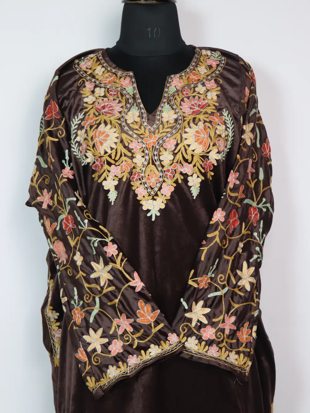 A chocolate brown pheran crafted in Velvet fabric features aari and zari work at neckline and sleeves in floral patterns and it has practical pockets both side for handy use.