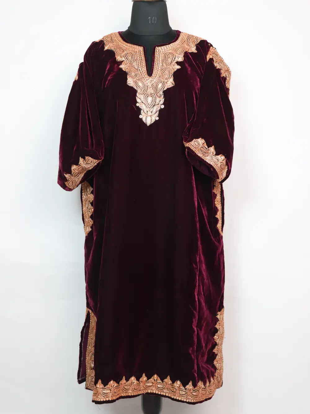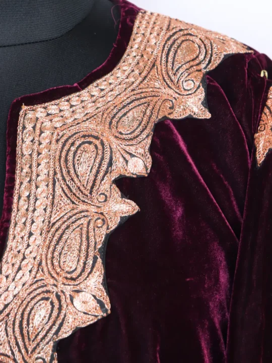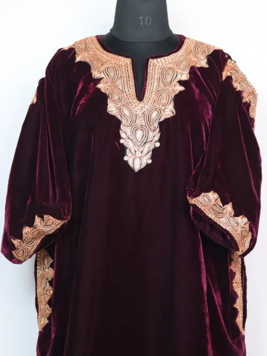 Wine colour makhmal and Botte Tilla in continuous badam at neckline, qoraab sleeves and border bring a luminous touch to this wine colour luxurious Kashmiri Pheran, its chest 52 inches and Length 44 inches ensure a generous item for winter layering.