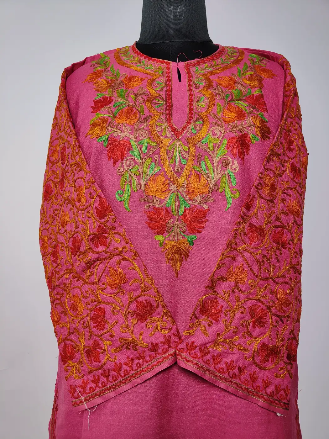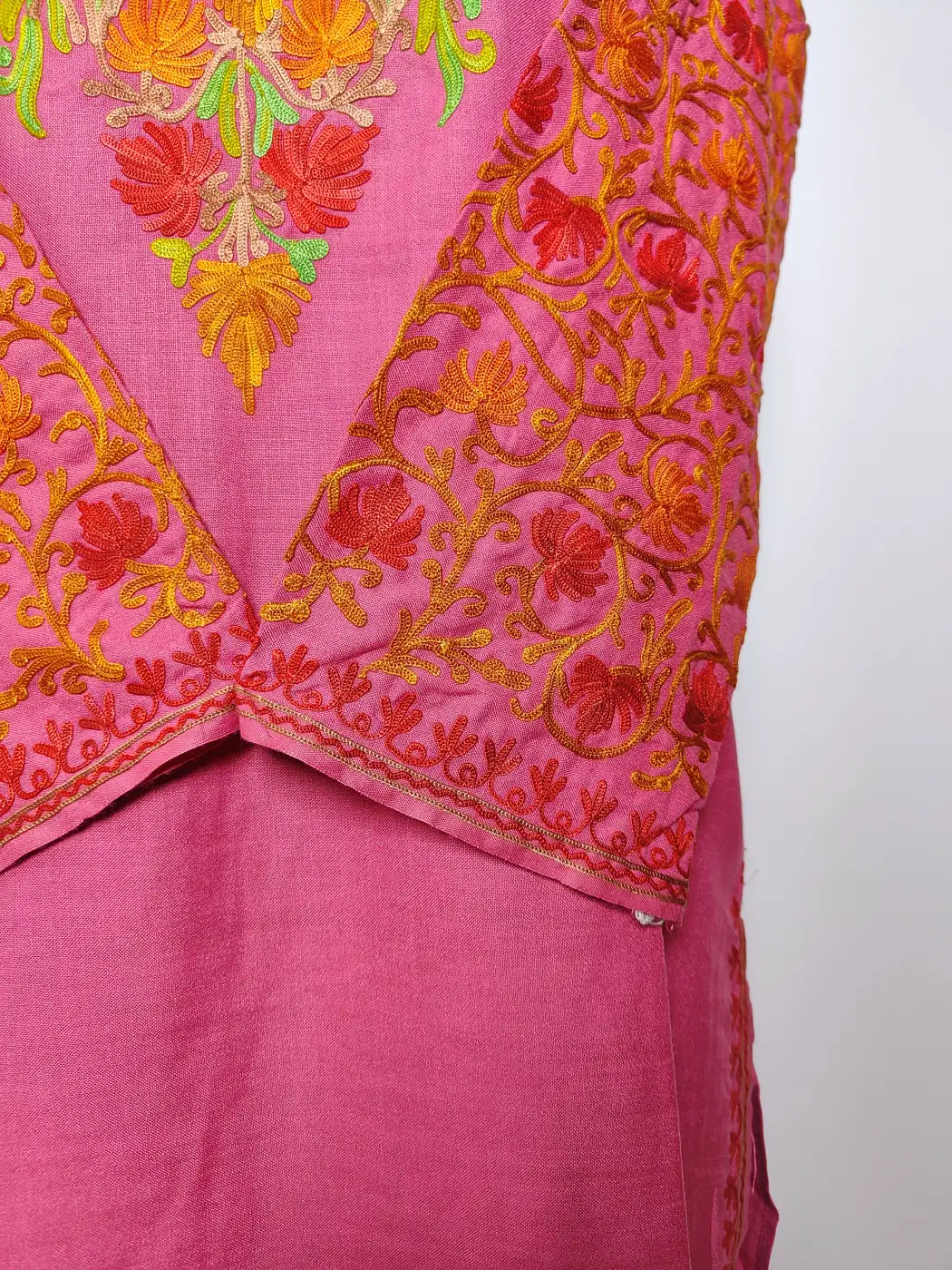 This Kashmiri kadhai kurta set showcases floral aari embroidery at the neckline with jaal work on sleeves. Crafted in magenta ruby cotton, the kurti and trouser together form a light and traditionally inspired outfit.