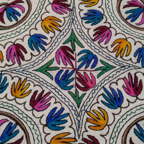 This *majestic round Namda* is a *premium Kashmiri treasure, featuring dense Hand Aari embroidery on cotton wool. Its expansive size makes it a perfect centerpiece for grand interiors, adding warmth, color, and a story of craftsmanship to your space. It is handcrafted with precision, also, this 4 ft Pure Wool Namda is perfect for grand interiors, hospitality spaces, or even as a decorative wall hanging. Its bold embroidery and soft texture make it a prized possession for lovers of traditional art.