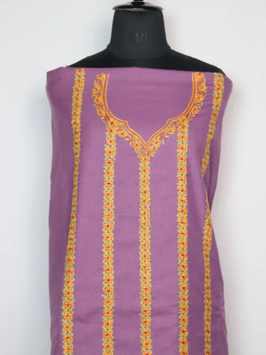 This beautiful Lavender spun fabric unstitched suit features fine Hand aari embroidery around the neckline with delicate floral lines running vertically across the fabric. It comes as a 2-piece set with kameez and salwar, ideal for ocassion and everyday wear.