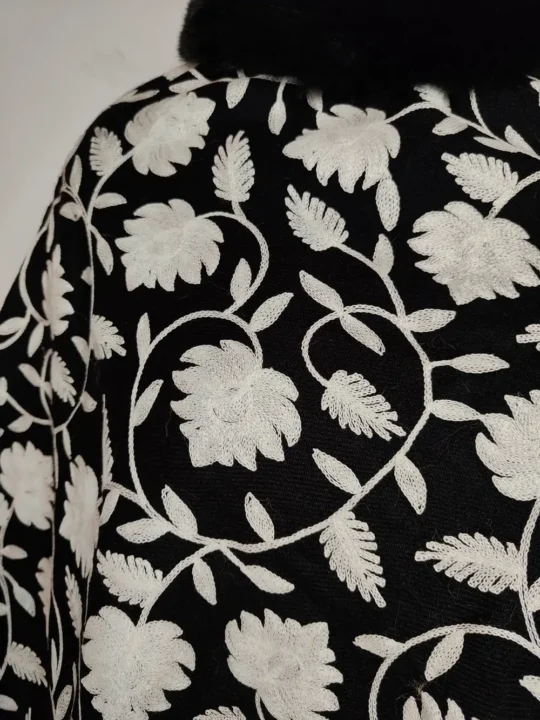 Elegant and warm (garmahat bhara), this Fur Poncho in Cashmilon has been made to embrace the winter season. Its black surface carries floral Aari embroidery in white tones all over. Its 37-inch length and 43-inch width create a graceful drape. Designed with no lining for a free, light feel. It is a stylish pick among woolen Kashmiri ponchos with fur.