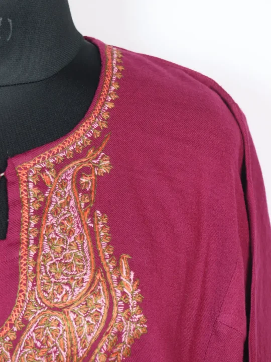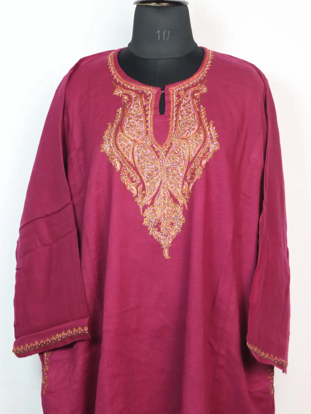 This magenta colour Kashmiri feran has been crafted in raffal wool fabric. Its neckline is ornamented with hand sozni embroidery in badam motifs that elevates feel. It comes in chest size 58 inches and length 44 inches that provide a flattering roomy fall.