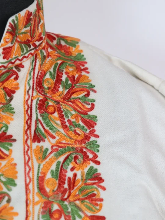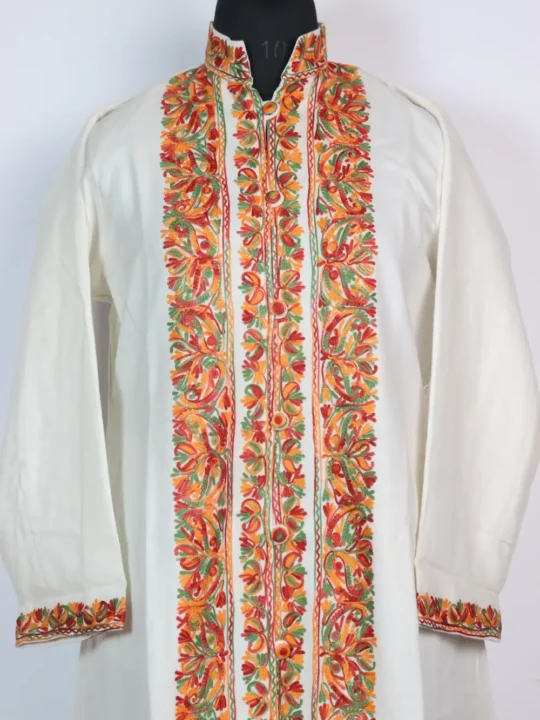 The long Mahira coat in white Cashmilon wool and Aari embroidery offers a soft, cozy layer for winter days. Red, mustard and green floral and badam motifs embroidered along the borders add subtle elegance. Measuring 42 inches in length, this coat layers easily over other outfits. Comes fully with lining for warmth and comfort, this coat merges functionality with delicate design, which makes the coat a versatile winter piece for daily use.