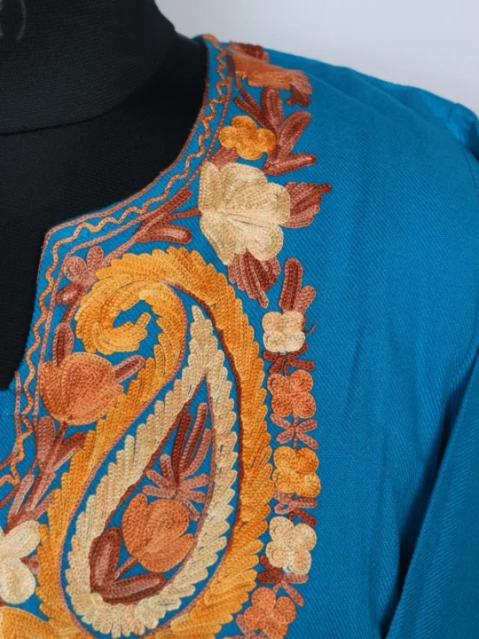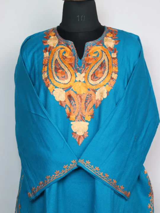 Warm and comfortable cashmilon wool makes this feran easy to wear, while the neat bada, floralĀ embroidered aari neckline adds a classic and graceful detail.
