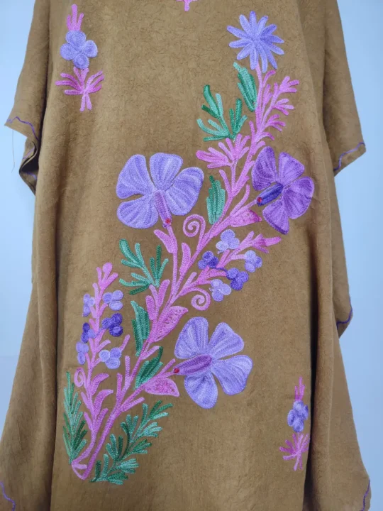 A detailed floral motif defines the front panel of this Kashmiri aari work kaftan, paired with continuous embroidery along the neckline. Made in brown crush cotton, the Kashmiri aari work kaftan feels light, soft, and beautifully understated.