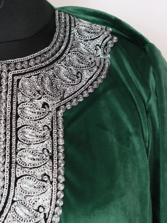 Rich Holland Velvet Pheran in green adorned with Zari Tilla embroidery and delicate continuous badam at the neckline offers Kashmiri charm. Comes in 57-inch chest and 44-inch length, this traditional loose Pheran is a warm statement piece for elegant winter attire.