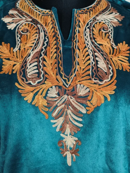 Gleaming like a winter moon, this Makmal Pheran Set stands out for its soft dark green texture and badami style floral Aari work along the neckline. It is ideal for 8-9-year-olds with a 42-inch chest and 32.5-inch length, it promises both warmth and style. It comes with a trouser to complete the outfit. It is a lovely pick under Kashmiri kids pheran listings.