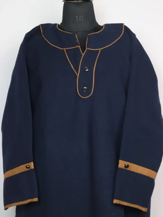 This unique fleece tweed pheran comes in a navy shade with brown piping on the neckline and sleeve borders. The soft fabric makes it warm and comfortable, while the buttoned front and clean detailing give it a smart, everyday winter look.