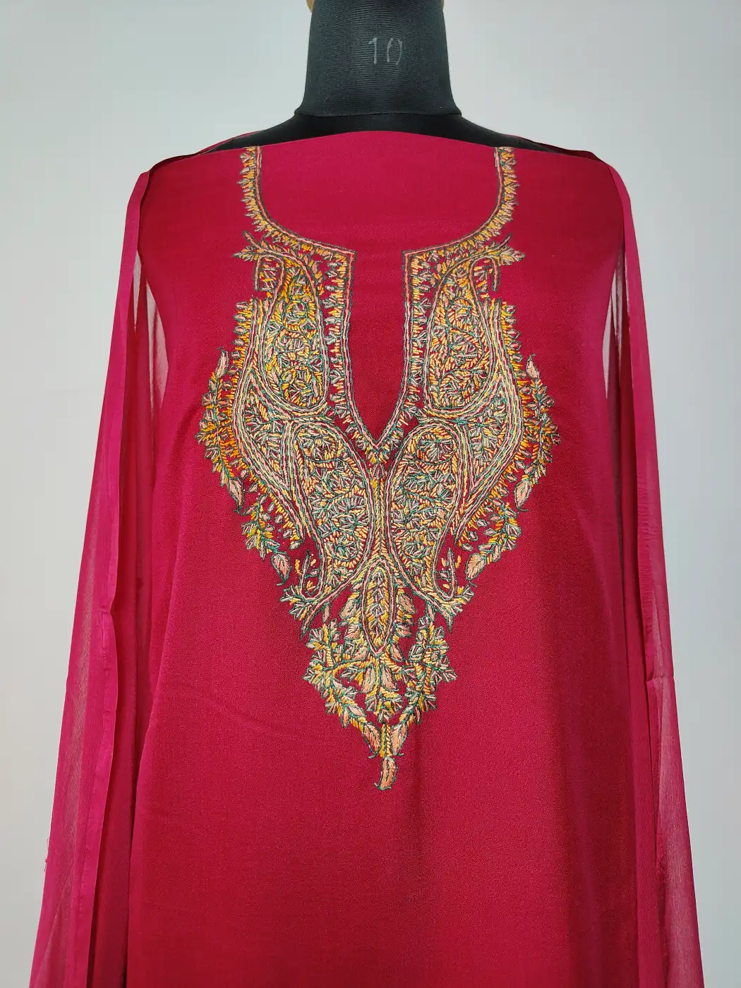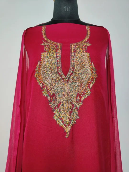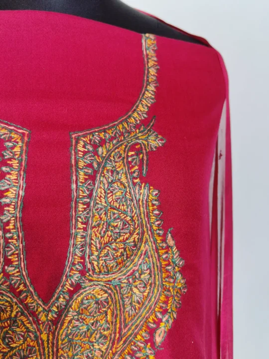 This maroon traditional Kashmiri suit is made in comfortable summer cool cotton. As it is given as an unstitched kurti with trouser and dupatta, it lets you tailor the silhouette exactly according to your own style. Its kurti features hand sozni embroidery which is arranged in elegant badam motifs, gives this piece a heritage feel.