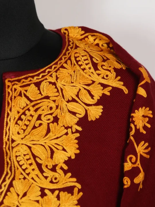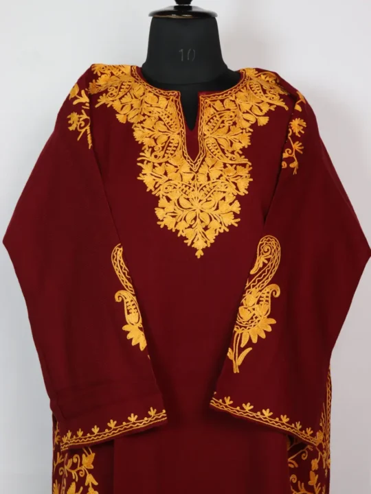 Wrapped in Cashmilon Wool this maroon Kashmiri pheran brings soft winter warmth while Aari badam-floral work in mustard threads decorates the neckline and side panels with jaal work and sleeves with booti style work. This feran sits in a 48.5 inch chest size and 41 inch length and includes practical pockets at both sides for ease. You can wear this Kashmiri pheran for quiet winter days or small gatherings, Order this pheran online and bring a touch of winter charm home.