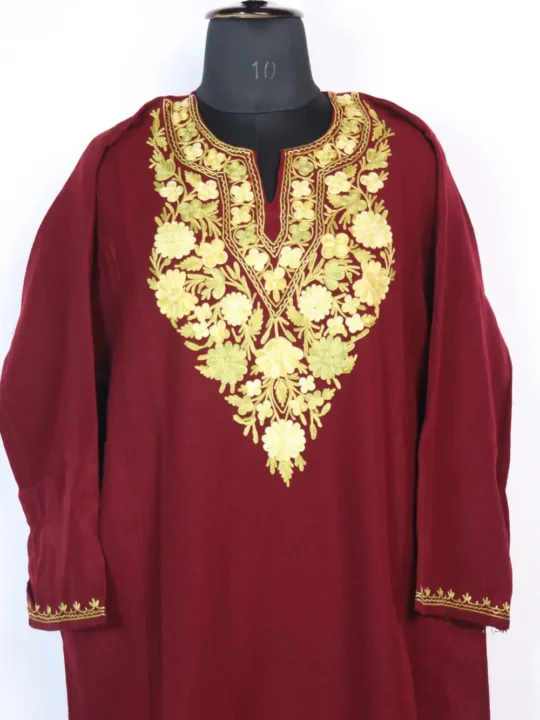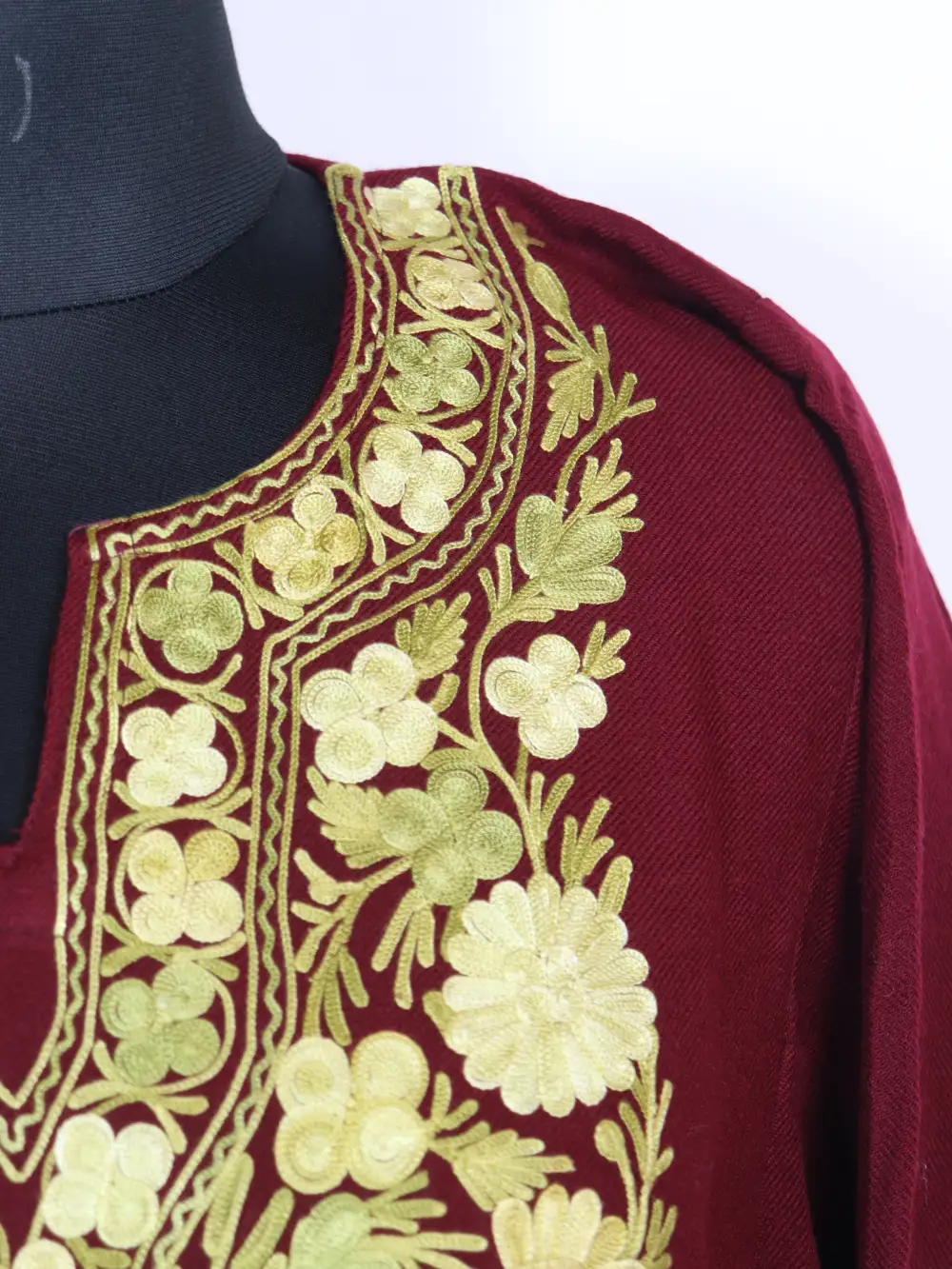 Classic maroon Cashmilon wool and Aari embroidery around the neckline in floral motifs. Chest size 50 and length 44.5 inches gives an easy fit for layering; this maroon Pheran keeps the embroidery focused and the rest of the phiran calm and wearable.