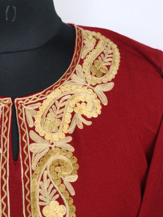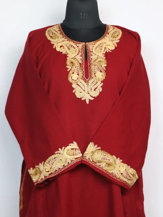 maroon coloured Kashmiri faran with Aari embroidery in badam patterns, at the neckline, sleeves and border and pockets on both side is a practical winter layer.