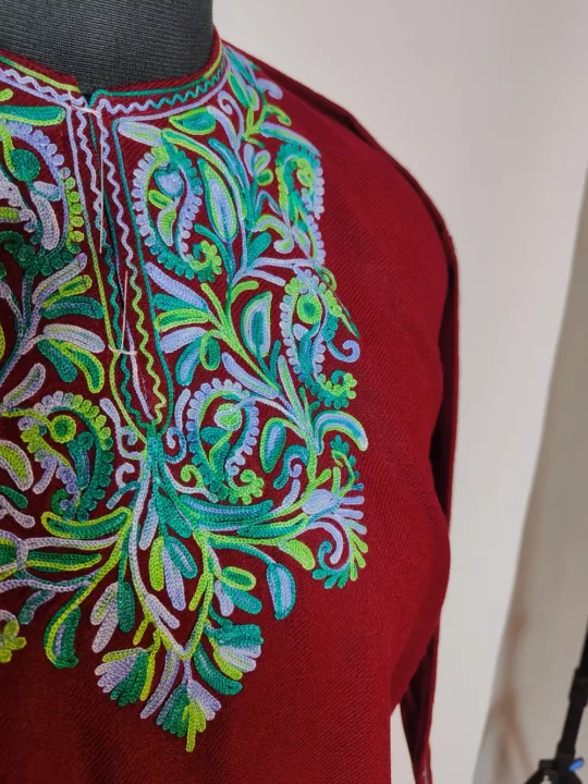 Kashmiri girls firan in maroon hue comes in cashmilon wool for a cosy fall, furnished with floral aari embroidery at the neckline. Its both-side pockets make it easy for everyday winter wear.