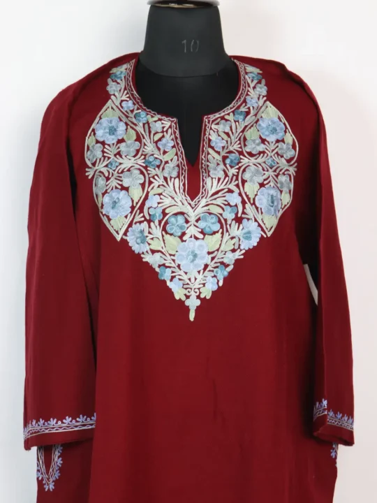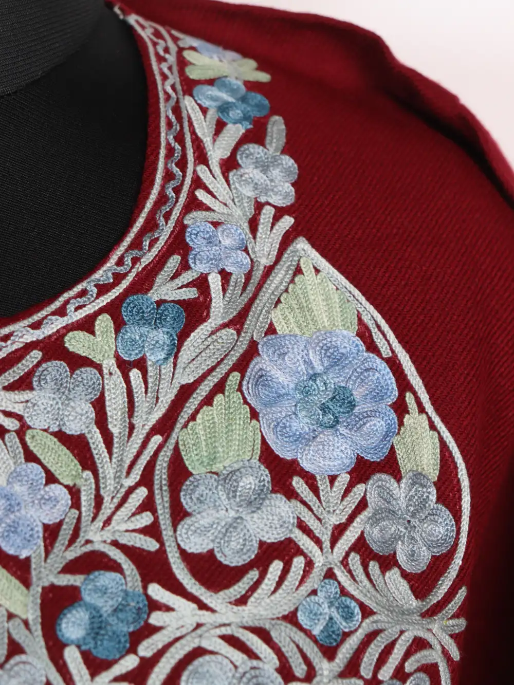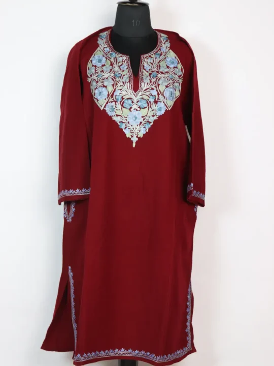 This elegant maroon Cashmilon wool pheran features exquisite floral Aari embroidery in soothing shades of blue and mint, it is beautifully accentuating the neckline.
