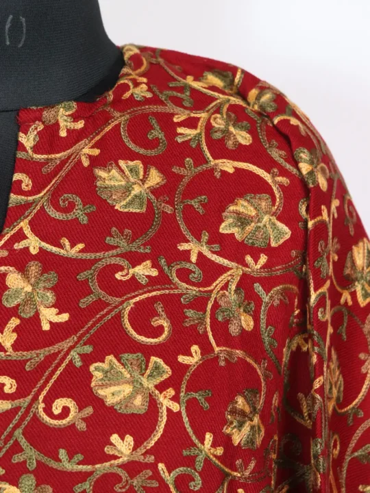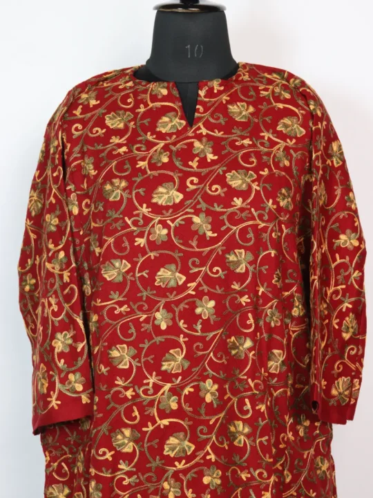 A refined Aari at the neckline in green shaded threads lifts this maroon Cashmilon Wool Phiran sized 50 inch chest size and 44 inch length. This maroon pheran features all-over front back aari in chinar style florals, which makes it perfect for calm, winter dressing. You can layer it with a warm stole or trousers, you can buy phiran online at 1399 and welcomes a subtle piece of Kashmiri craft into daily wear.