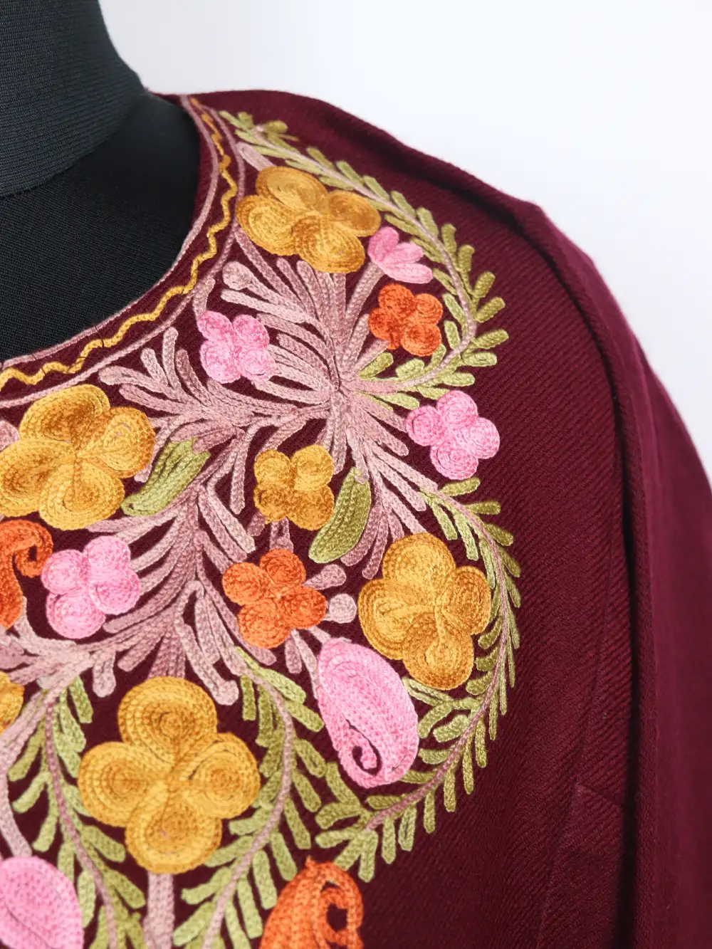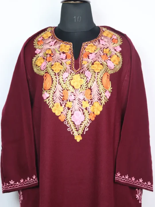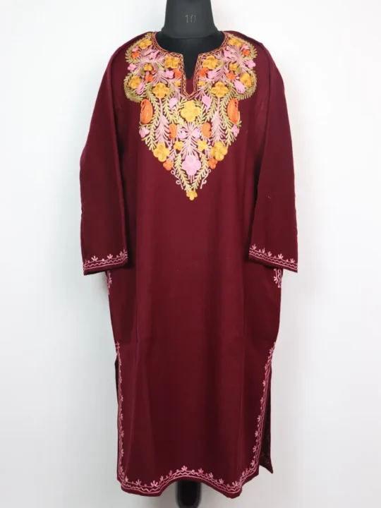 Made in cashmilon wool this maroon hue pheran shows aari work at the neckline where small badams have been stitched into a refined band. It includes pockets on both side to keep essentials.