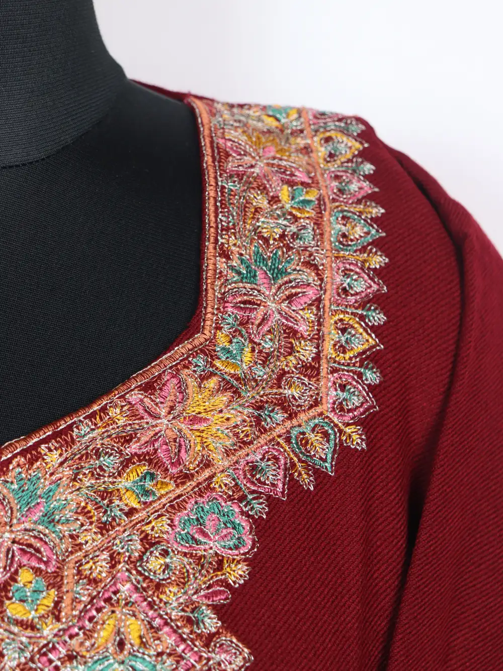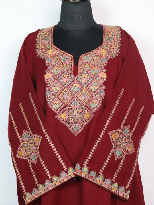 Cashmilon wool forms the base of this Pheran kashmiri which is decorated in sozni kadhai with elegent motifs enhancing the neckline and sleeves. Its chest size 52 inches and length 43 produce a relaxed fall.