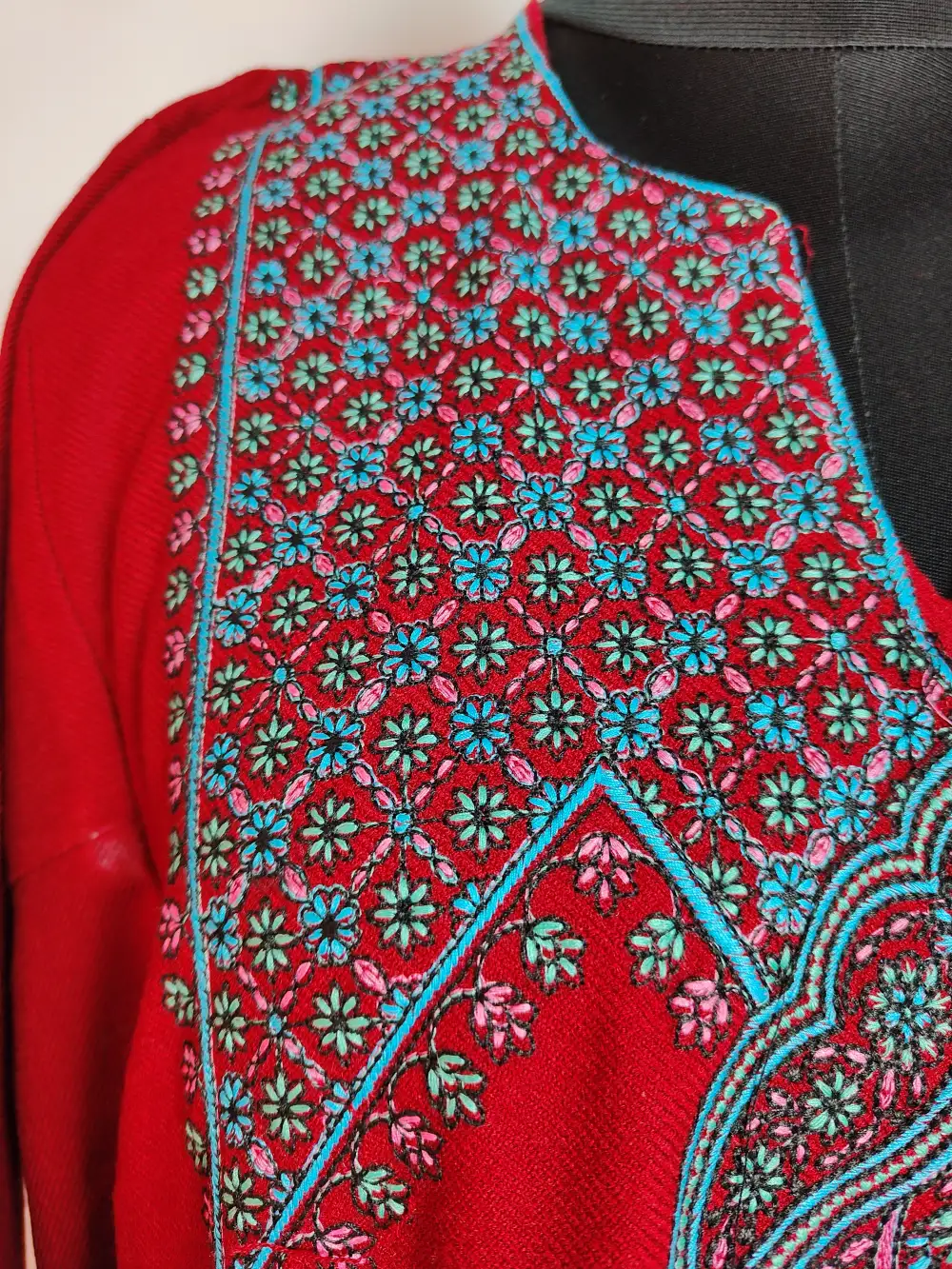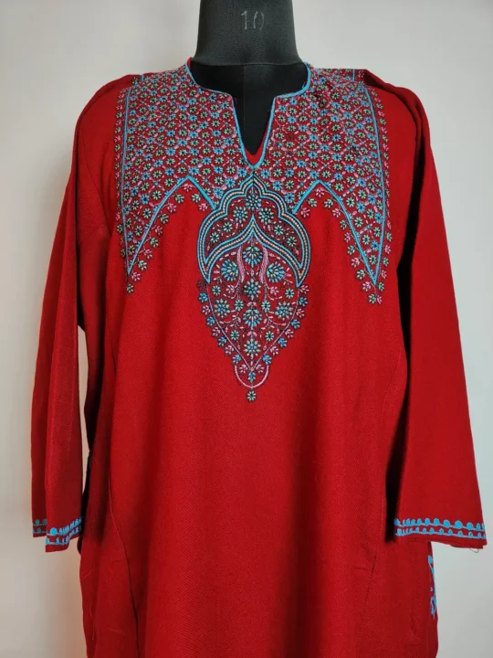 A maroon Kashmiri phiran dress in Cashmilon Wool features geometrical patterned sozni embroidery at the neckline and it includes pockets on both the sides for practical wear.