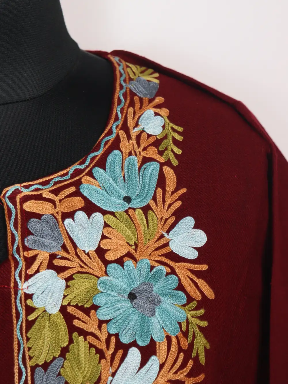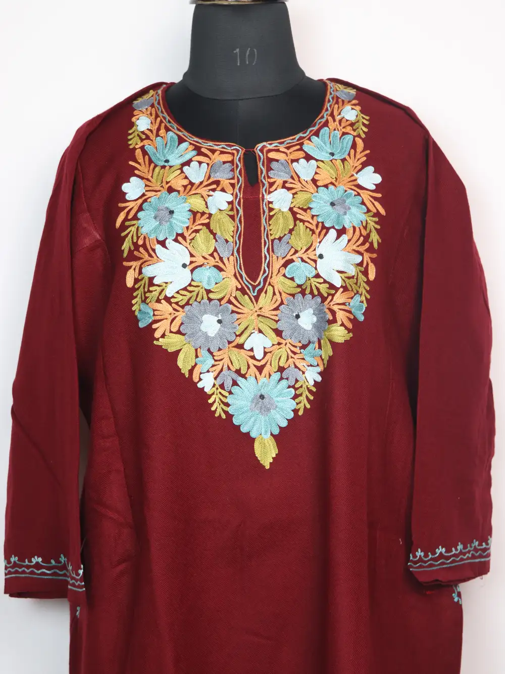Created from cashmilon wool for everyday winter use, this pheran is presented in maroon colour. It highlights aari embroidery with floral neckline detailing.